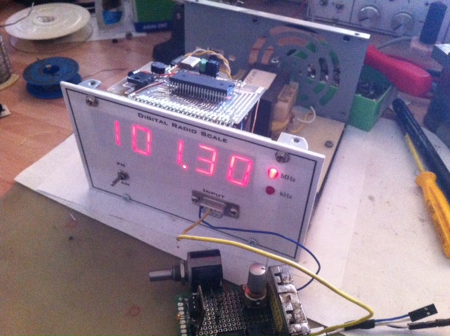 Üdv, készült egy rádióskála az LC 7265-ös IC felhasználásával. az IC lábtávolsága 70 miles, igy "SMD módra" lett beforrasztva. Az előlapon a papír pedig nem lett kivágva, átlátszanak rajta a LED-ek. Ilyen. Az előlapon azért az a csatlakozó, mert később az erősítőt a dobozon kívülre szánom, külön FM-re és AM-re, oda pedig kell a tápfesz is.