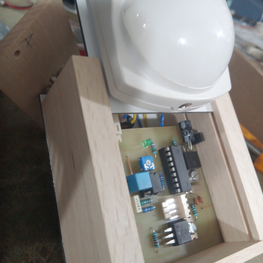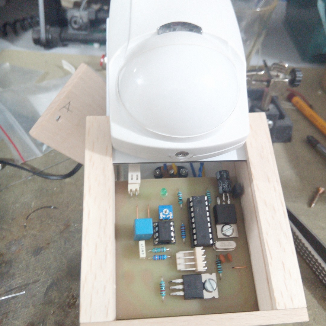 A másik projekt pedig egy autómatafénykapcsoló, pir szenzorral. Amolyan kényelmi dolog a vaksötét konyhában. 10 perc után kikapcsol, ha nincs mozgás. Ha mozgás van, akkor újraindul a számláló.