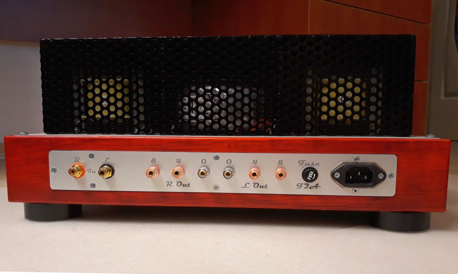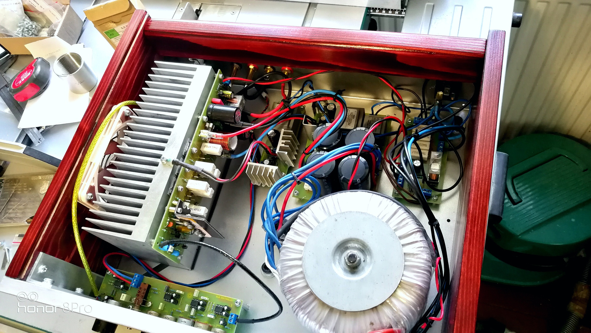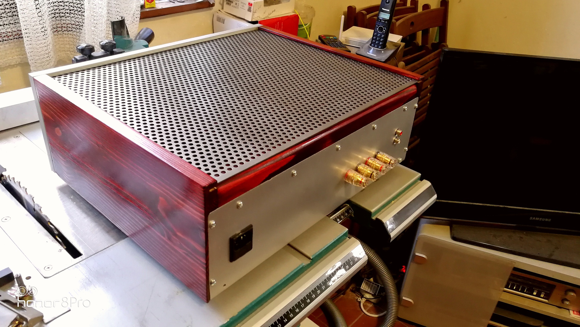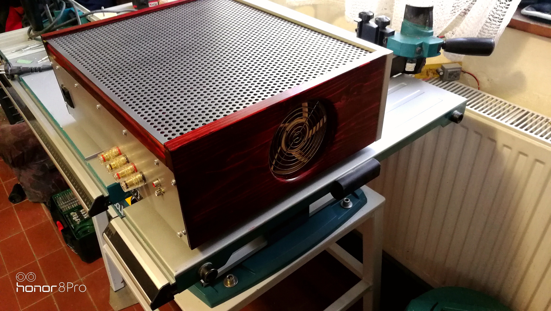 nagyon szép lett. Különösen tetszik a hangerővel szimetrikusan elhelyezett kis retro műszer, meg a belső szerelés is azzal a forfüll léccel, vagy hogy hivják. Igaz, nem egy gyerekbiztos darab a csövek miatt ![]() Nem látom jól, a földelés be van kötve? Az alsó fém hálóra és a trafók fém dobozára mindenképpen kellene.
