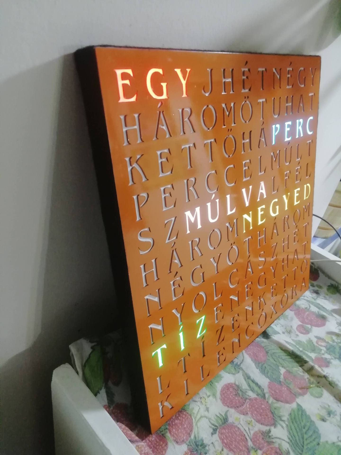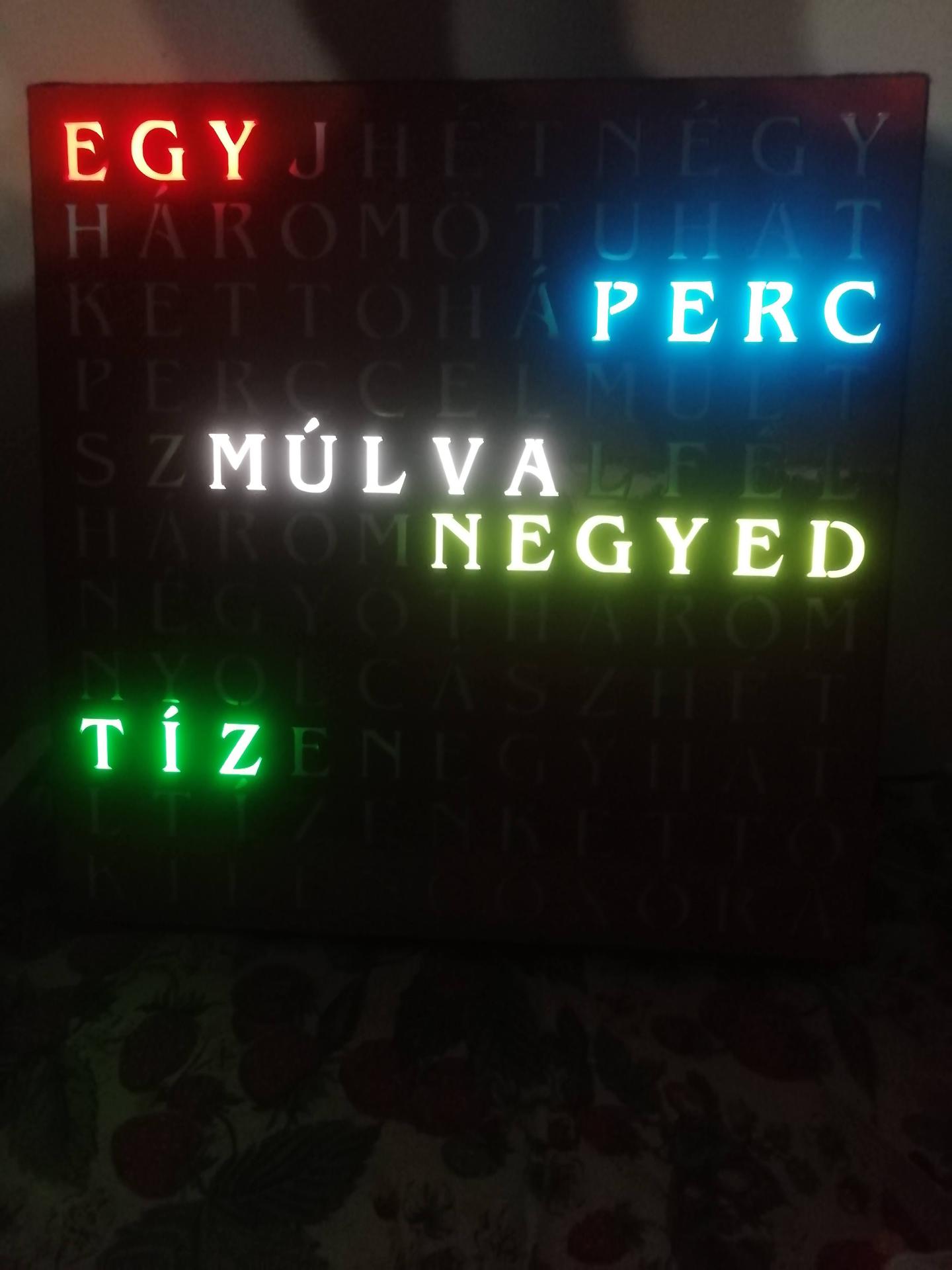 Elkészült a szöveges órám „Word clock”. Bár mondjuk még nem teljes, mert a DS3231 RTC modul még nem érkezett meg. Egy Arduino nano, egy DFPlayer Mini és WS2812B led szalag van benne. Az előlap 320x320mm-es a betűmagasság 23mm. TruTops Boost-al terveztem és 1mm-es lemezből vágtam ki. Az egész óra vastagsága 20mm. Így RTC modul nélkül nem pontos, mert 1 hét alatt késik pár percet viszont cserébe látványos. A DFPlayer Mini a Big Ben hangját játsza le minden órában reggel 08:00 és 20:00 óra között.