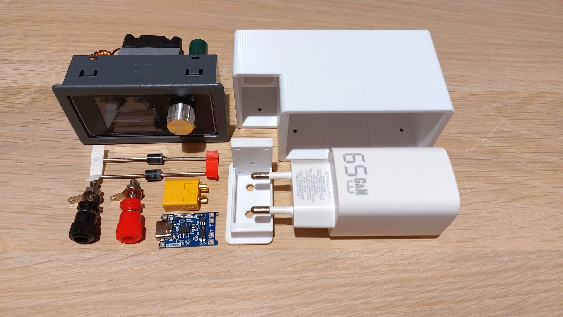 Építettem egy kis hordozható tápegységet. Kínai modul az alapja. Működik 65W-os telefon töltőről, vagy Li akkuról. A töltő amúgy is mindig nálam van, ha utazom. Két 30A-es Schottky választja el a két bemenetet.