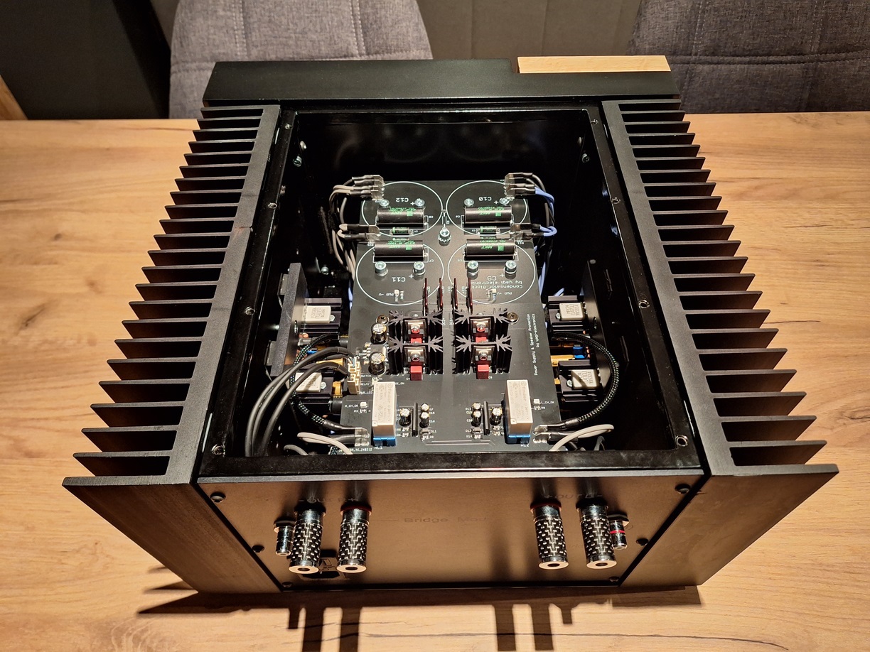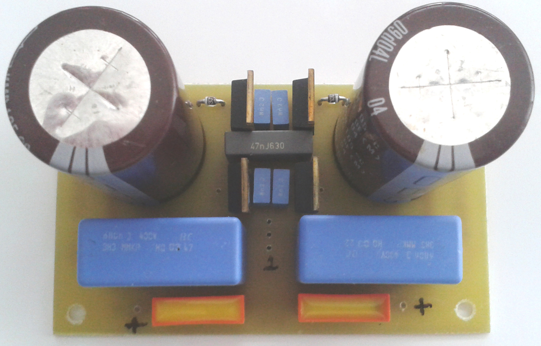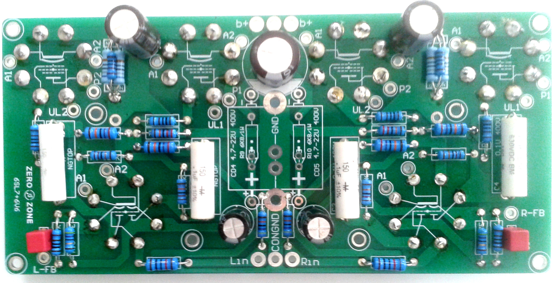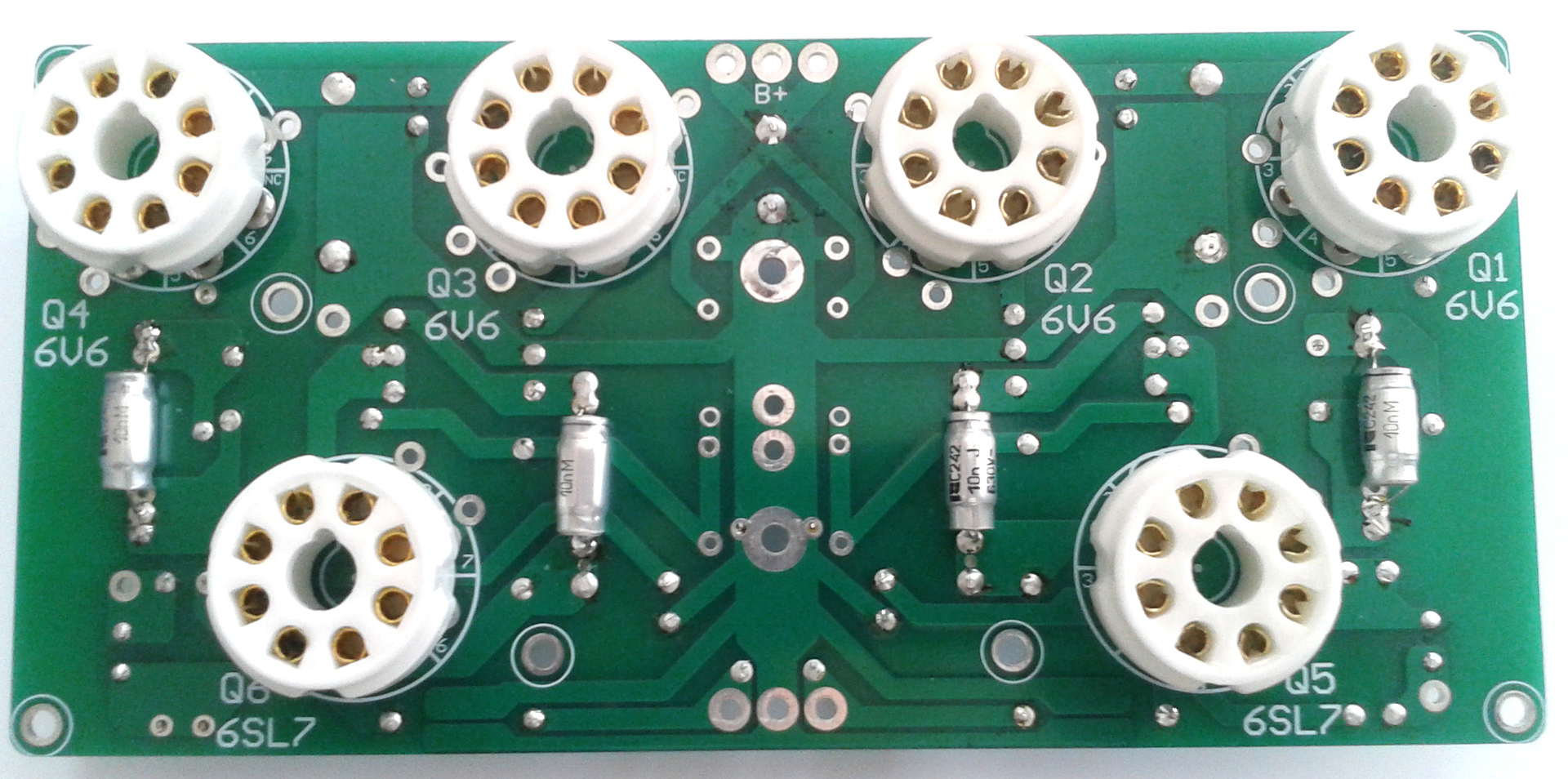Korrektnek láttam ezt a nyákot - kit/ebay - és elkezdtem az alkatrészekkel benépesíteni. A képeken látszanak az alkotók típusai. A két előcső tápját külön trafó és lebegőtápos stabilizátor adja, az anódokat diódákkal csatolásmentesítéssel gondoltam megoldani. Ilyen megoldást régi előerősítőben is láttam, egyik oldal puffere ugyan nem tud besegíteni a másik oldalnak, de az adott puffer csak a saját végcsöveinek a táplálását végezheti. A holmi 2 x 10W-ot képes produkálni a 6P6Sz végcsövekkel. Anódfesz 300V, az előcsövek stab tápja szintén 300V lesz. Diódák a hídban HFA08..., csatolásmentesítők 2x BYD33J, párhuzamos 8,2nF, szűrőelkók 2x470 uF, 0.11 esr, 680nF- 10nF a két oldalnak külön. Kimenők még csak papíron.