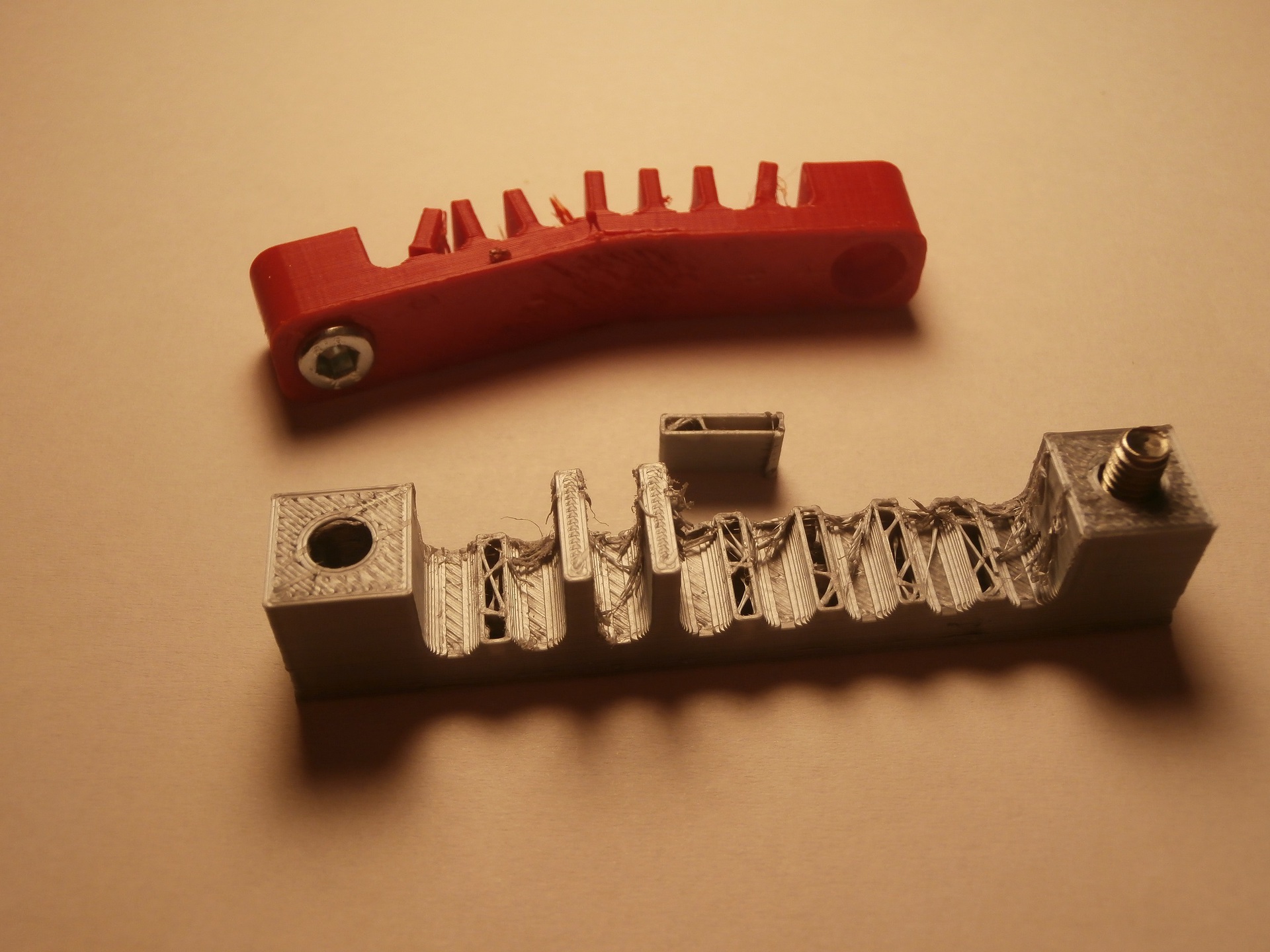Tervezéskor-nyomtatáskor fontos, hogy a fellépő erőkkel is számolj. Látszik, hogy a mellékelt alkatrészeket a sík lapjával az asztalon nyomtatták, a közbenső lapkáknál szépen látszanak a rétegek. A rétegek közti tapadás ekkora alkatrészméreteknél biztosan kérdéses lehet. Látszik is, hogy a belső fogak a rétegek közti elválással törtek ki. Ezen lehet javítani, ha például az oldalára fektetve van kinyomtatva, vagy egy adott szögben elforgatva, hogy az ébredő erők ne a rétegekkel párhuzamosan tudják az alkatrészt terhelni.
