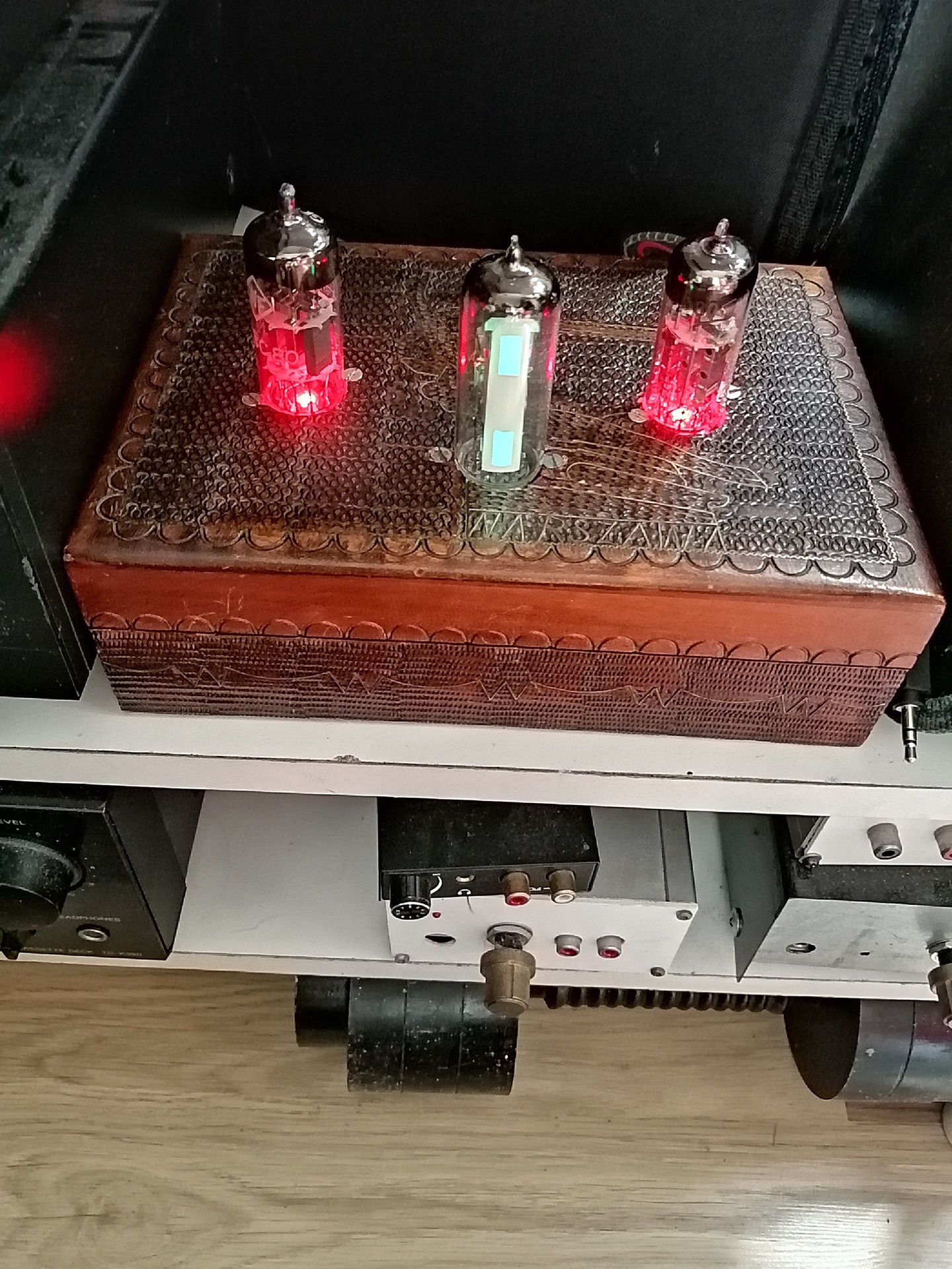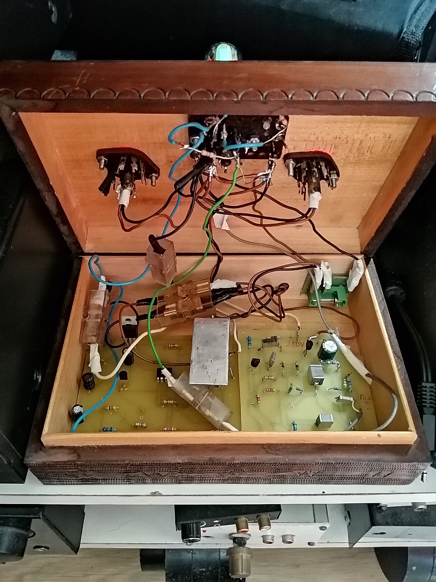 Mikrofonos kivezérlésjelző em84 csővel, kapcsolóüzemű táppal, bolhapiaci fa díszdobozba épitve. A plusz 2 cső csak dísznek van.