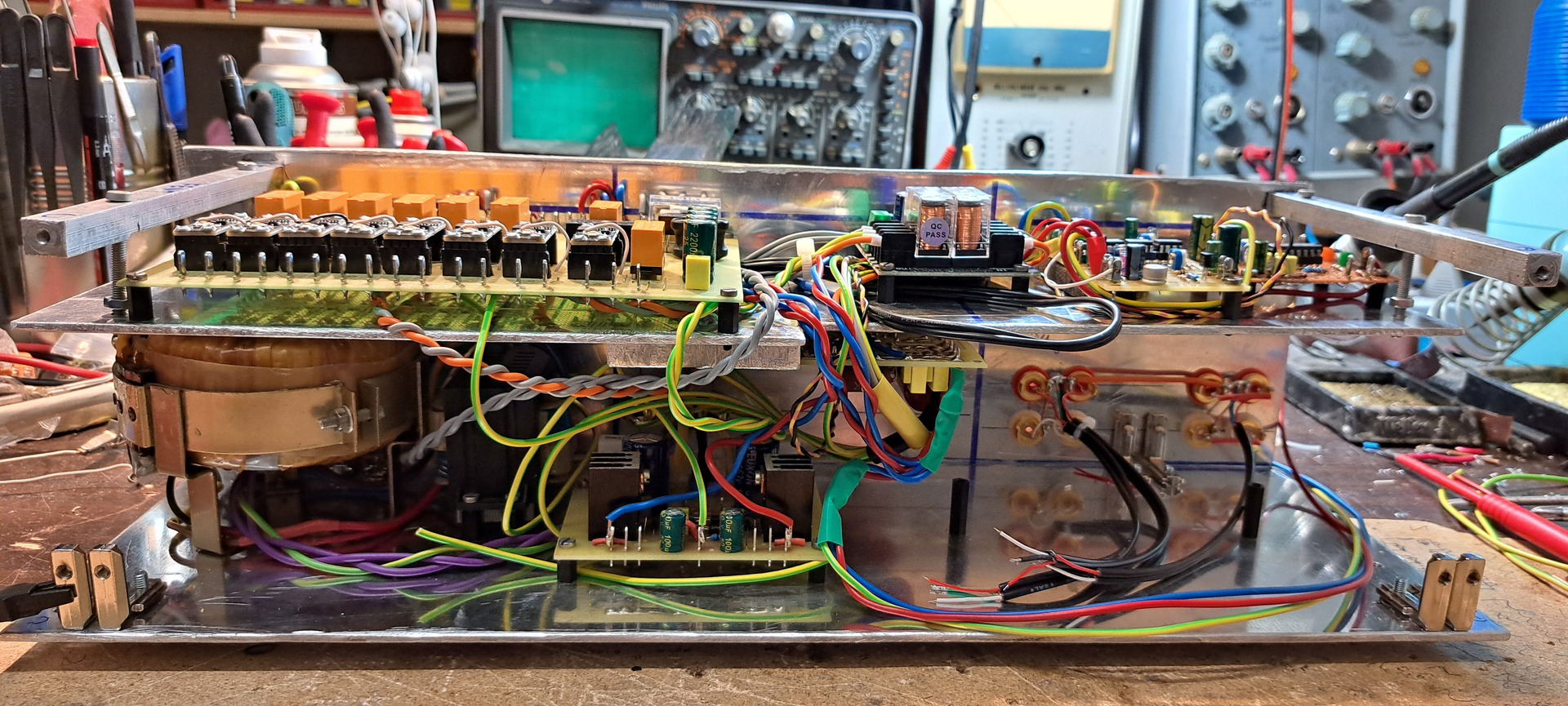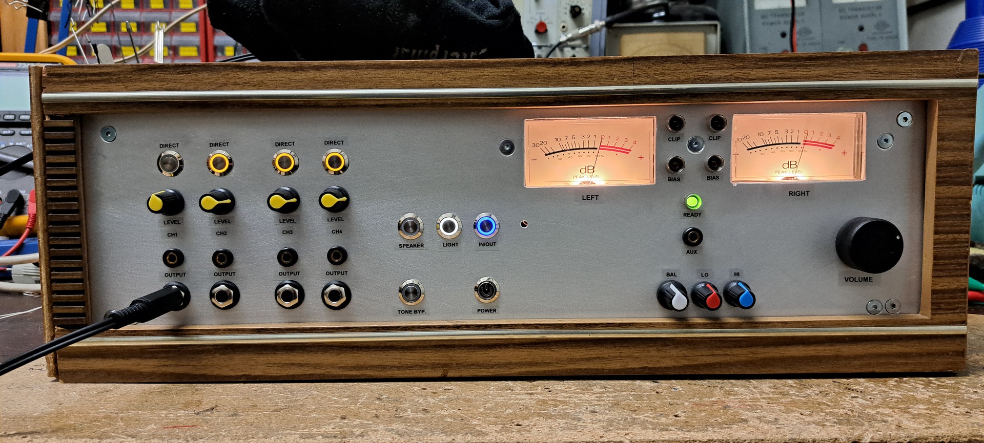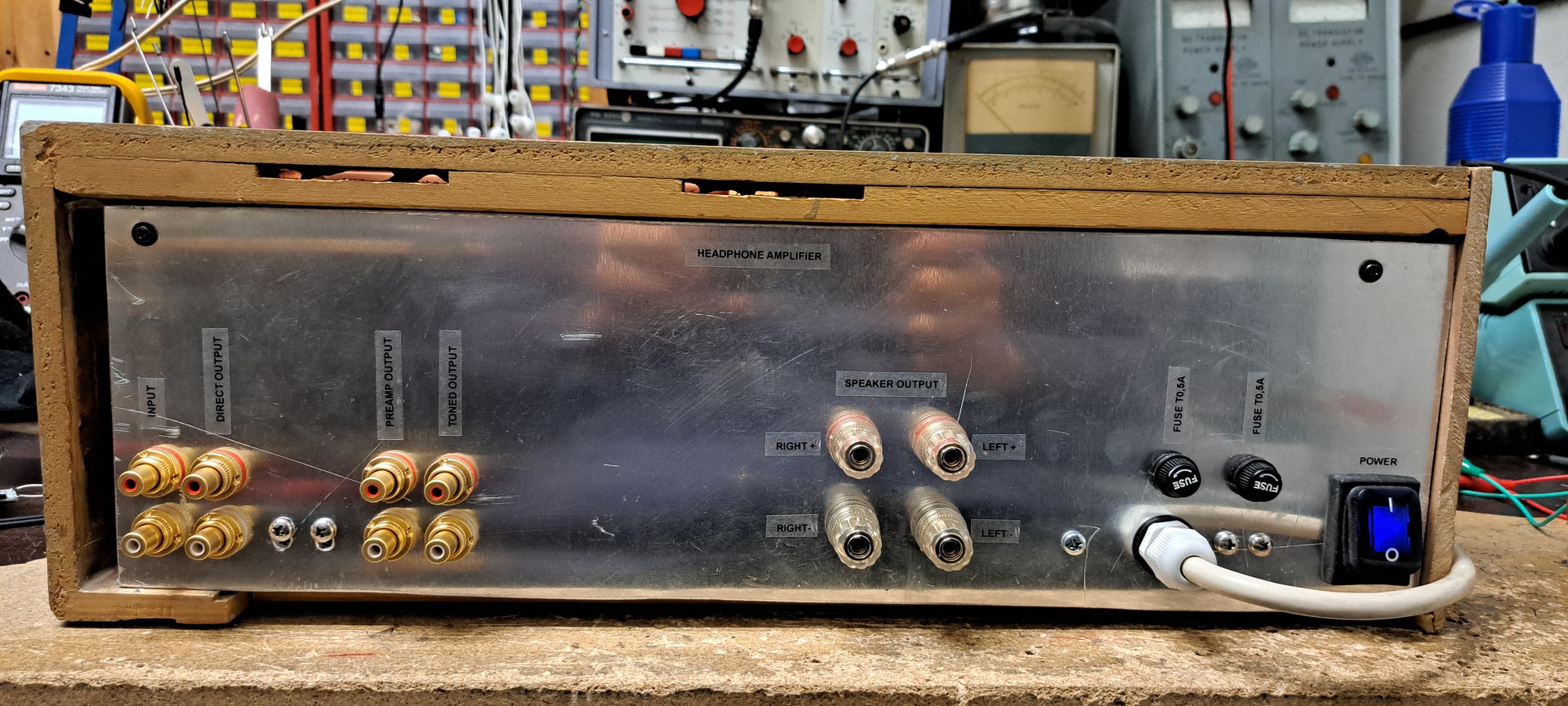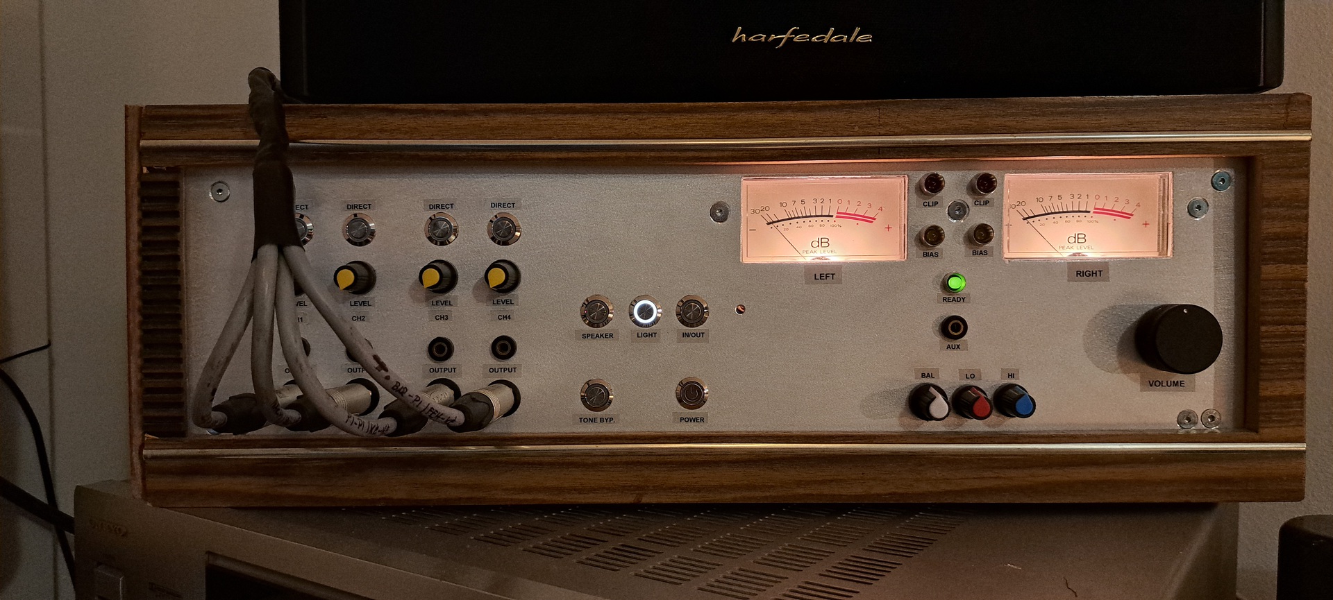 Egy Videoton RA rádió burkolatát használtam fel a retrós megjelenéshez, a fő trafót gondolom sokan felismeritek Beag AET453-ból származik, a segédtrafó pedig egy összetört burkolatú asztali lámpáé volt. Előlapot, hátlapot, szerelőlapot 3mm Al lemezből készítettem. Feliratok "black-on-transparent" szalagra nyomtatással készültek. A műszerek egy régi deck-ből valók még régebben bontottam menthetetlen mechanikájú készülékből. Előfok egy sima baxandall, előlapi gombbal választhatóan a jelút kikerüli. AD827 műveleti erősítő az eleje, ennek a típusával kísérleteztem, több típust is belepróbáltam, és ezzel szólt a legszebben. A hátulja ronda és igénytelen. Én voltam, vállalom.