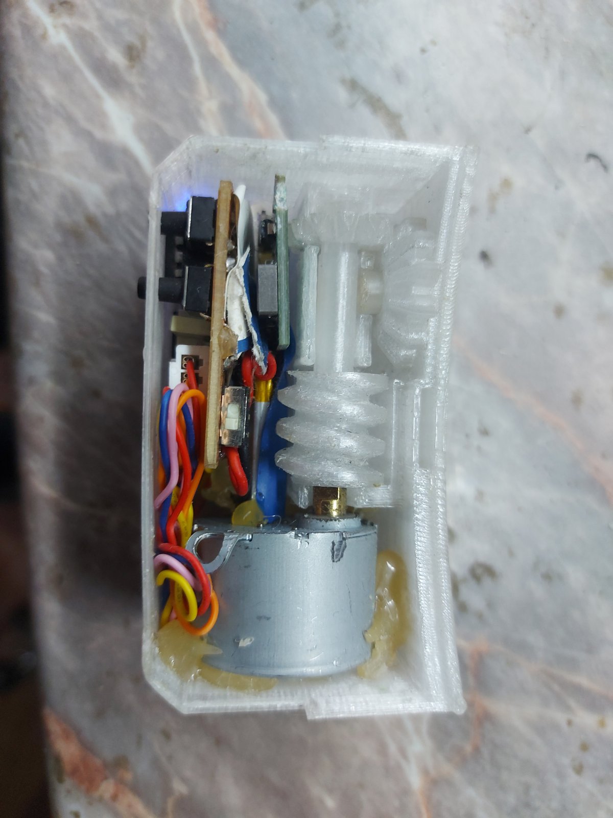 Fogaskerék áttételű step motor. Méretéhez képest jó erős.