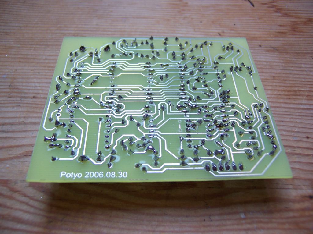 Fotózással csináltam a NYÁKot, és beleraktam kémiai ónozóba is, azért ezüst színű! A forrasztások nekem sem tetszenek, de sajnos azért sikerült ilyen rosszul, mert a panelterven elég kicsik voltak a forrpontok, és csak 0.9es fúróm volt, és amikor kifúrtam, elég sok helyen felszedte a forrpont egy részét! Meg a 40lábú foglalatoknak nem volt pontos helye, kb 5mmrel el volt csúszva..