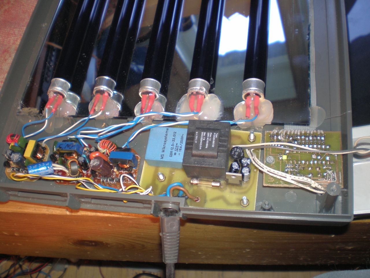Elkészült a második levilágítóm. Meguntam képkeretekkel üveglapokkal bíbelödni a higanygőz alatt, úgyhogy előástam az ágy alol a hibásan kapott Mustek skennert és új életet leheltem bele. 5db 8W-os T5 BLB 365nm-es UV-neon virít benne, 3-db kompakt elektronikával meghajtva. Az időt egy Attiny2313 számolya, saját program szerint.