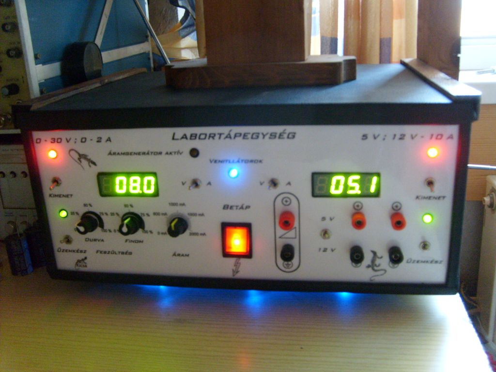 Szeretném bemutatni a ma elkészült művemet : Végre rendelkezem egy saját labortápegységgel. Amit tudni érdemes róla : Bal oldalán Attila86 féle 'kisebbik' labortáp : 0-30 V 0-2 A. A másik oldalon egy kiszuperált,fölösleges madzagjaitól megfosztott pc táp a maga 10 A-s terhelhetőségével. Kimenete 5 és 12 V között átkapcsolható. Az elrendezés alapjait a szabályozható táp adta,igyekeztem hasonlóan kivitelezni a másik felét is,néhol már lehet a túlbonyolításig mentem el,ki tudja?! Mindkét felét egy egy 8 cm-es ventillátor hűti állandó üzemben.('fejeként' kb 6 V-t kapnak). Illetőleg van még egy kis design is az aljában,rgb ledekkel,a 3 alapszín kapcsolóval váltható. A doboz teljesen saját készítés,ideértve mint a famegmunkálást,mind a kárpitozást. Igen sok munka volt vele de úgy érzem megérte. Az igazság az hogy a külsejére teljes mértékben büszke vagyok ám a spagetti a belsejében...hát lehetett volna szebb is. Ezúton szeretnék köszönetet mondani Családomnak a "nem baj,hadd dolgozzon csak a szobában,majd összetakarít később" hozzáállást...a szomszédoknak akik tűrték a munkafolyamatok hatásait...nah de komolyra fordítva a szót : Barátnőmnek aki az előlap kivitelezését segítette... Attila86-nak hogy életre kelt a táp rész... proli007-nek az RGB ledek ügyében... Alkotónak aki a feszültségmérőbe segített életet lehelni. Ha kihagytam volna valakit akkor elnézést! Várom az észrevételeket...és most jöjjenek a képek! Üdv