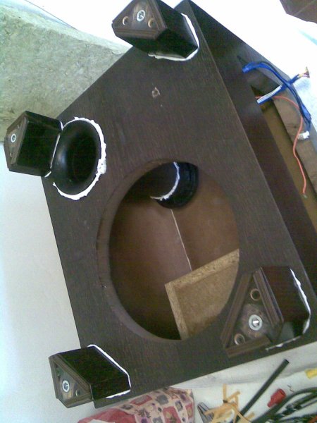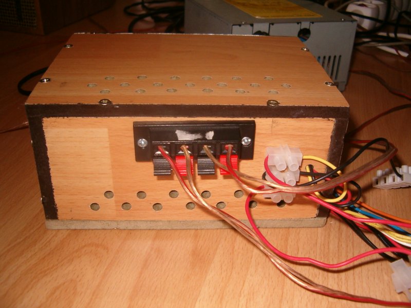 Össze állítottam neki 28mm vastag MDF-ből egy dobozt és tölgy furnérllal bevontam majd vízpáccal és selyemfényű lakkal kezeltem.A Sub hangszóró egy Ground Zero GztW25T lett.Még egy ventillátor szabályzó áramkört és egy 120mm-es 1000/perc fordulatú,gumibakos halk ventit is kapott,hogy ne égessük el a bordát! Így most 4*25W + 1*20W + 1*82W és nagy dinamika tartalékkal,erőteljes effektekkel.