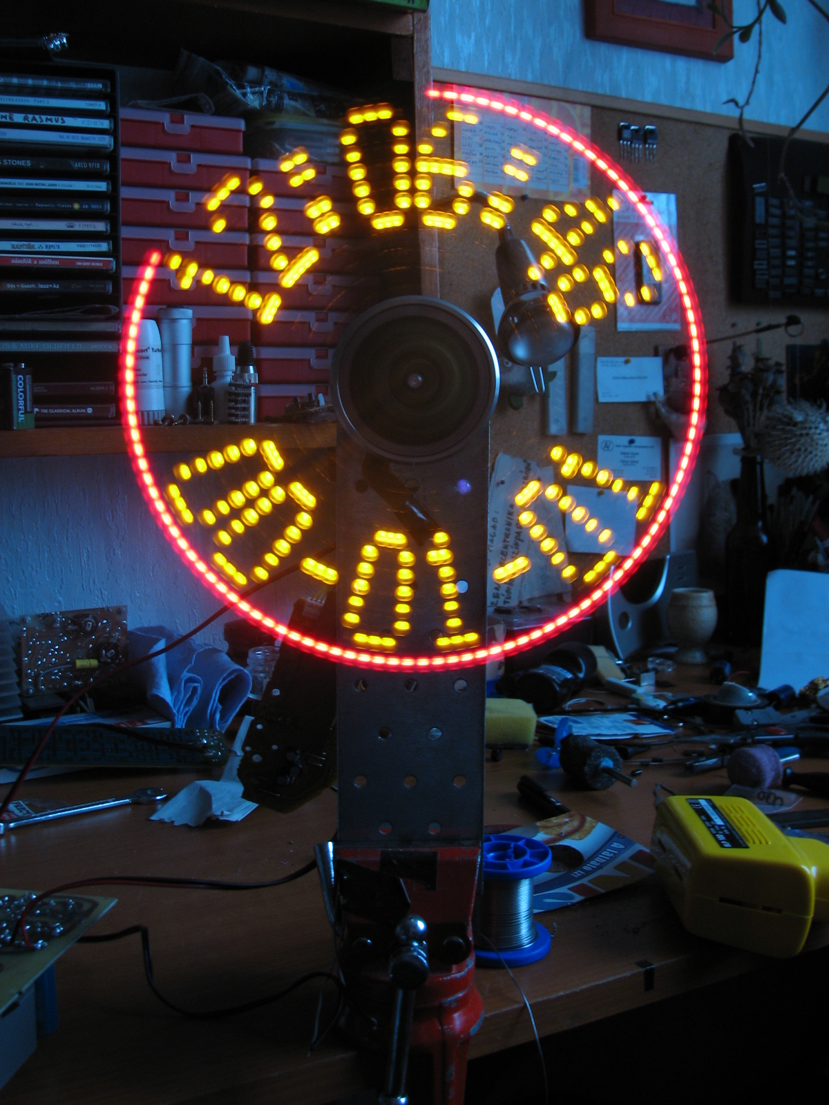 Legújabb építményem egy PropellerClock. Első PIC-es ill. SMD-vel szerelt projektem volt, de tökéletesen működik, és nagyon tetszik. Vicsys verzióján egy kicsit módosítottam, ventillátor helyett videófej motorral építettem meg, így gyorsabb, azaz nem látjuk a "számlapot" annyira vibrálni. Az első képen még a teszt folyamán látható, elnézést a rendetlenségért.. A többi a kész prototípust mutatja, bár sajnos ezek csak telefonos képek. A nyákokat vasalással készítettem, még nem kiforrott technika, ahogy ezek sikerültek, de én szeretem ezt a módszert, a fotózás drága, és féltem a szemem a HGLI-től, hosszútávon nehéz nem belenézni. Azóta viszont gyönyörű vasalós NYÁKjaim is születtek. Szerintem nagyon jó lett az óra, de várom a véleményeteket.. :yes: Üdv, Tom