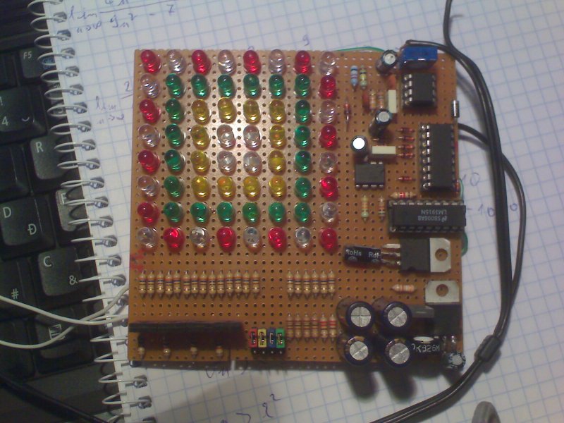 Régebben elkészült a fény-effektem. Négyzet alakban vannak a ledek elhelyezve, zene ütemére váltja a színeket. Kívülről befelé halad, ha beért, akkor kifelé. A középső ledek kékek. Egy 4017-es lépteti a színeket. Van másik üzemmódja is, LM3915 vezérli, ilyenkor sima kivezérlésjelzőként üzemel, szintén négyzet alakban. Sötét szobában tökéletesen elég ennyi led, "meghozza a hangulatot" Leírni elég nehéz a működését, majd készítek videót róla. Ez egy béta verzió, ezért próba panelre készült, ha végleges lesz, készítek normális panelt.
