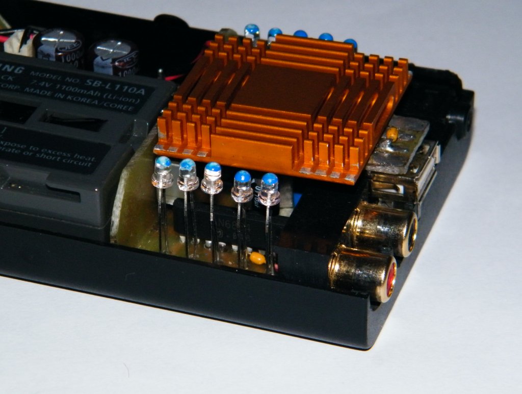 A kis dobozban elfért még 2x5 LED-es kivezérlésjelző (AN6885) is, de ez kapott egy kis kapcsolót (energiatakarékosság). Van még benne egy USB csatlakozó is, aminek csak a tápvonala él, egy 78L05-ösön keresztül meghajtva, erről mehet az MP3 lejátszó.