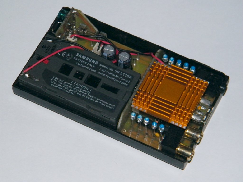 Ezt a kis erősítőt kiruccanásokra (kirándulás, biciklitúra, LANparty) csináltam, ahol a méret, és a mobilitás a lényeg. A táp egy Samsung kamera 7,4V/1,1Ah-ás li-ion akksija ( a saját töltőjével töltve). Egy TDA7297-es sztereó erősítő dolgozik benne, ami így hajtva kb 2-4W-ot szolgáltat oldalanként. Mivel ilyenkor nem a discozás a lényeg, ez több mint elég. Én egy 5.1-es régi Philips hangrendszer 2 szatellitjét (10W/4ohm) használom hozzá, de a 30W-os tesla-t is szépen meghajtotta.
