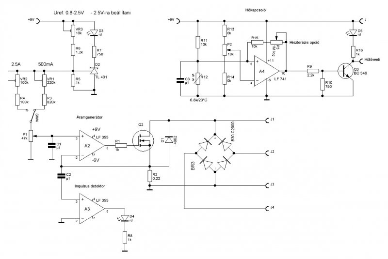 Üdv, nálam pedig egy műterhelés készült, a RT-ben megjelent kapcsolás szerint. Némi kiegészítéssel, váltakozóáramon is működik, trafóhoz ugye, és indikálná, ha a feszültség nem statikus, de ezt a részt még nem épitettem bele. A FET melegedését a hőkapcsoló jelzi... A kapcsolóüzemű tápoknál lehet olyan jelenség, hogy a "nagy" terhelésnél periódikusan szaggatja a kimeneti feszültségét. Ezt indikálandó, terveztem bele ezt a lehetőséget, ha ez olyan frekvenciával történik, ami a műszeren nem látható.