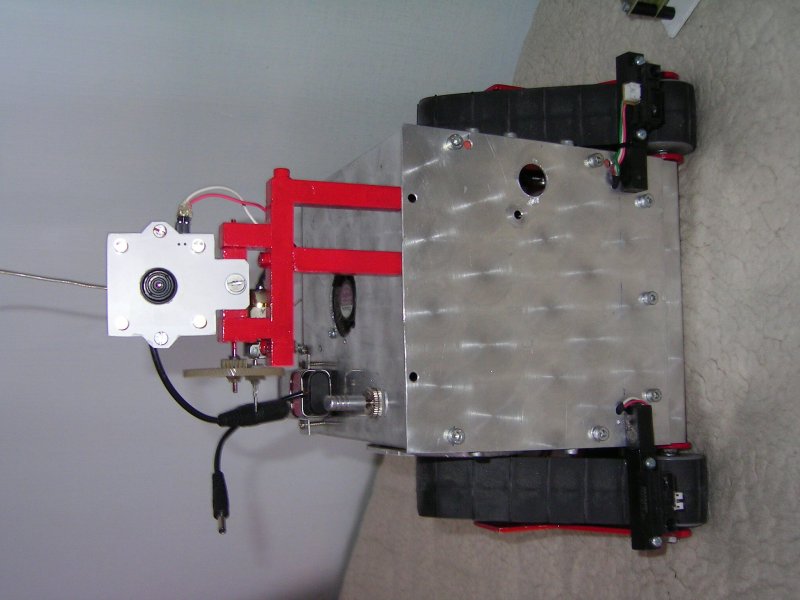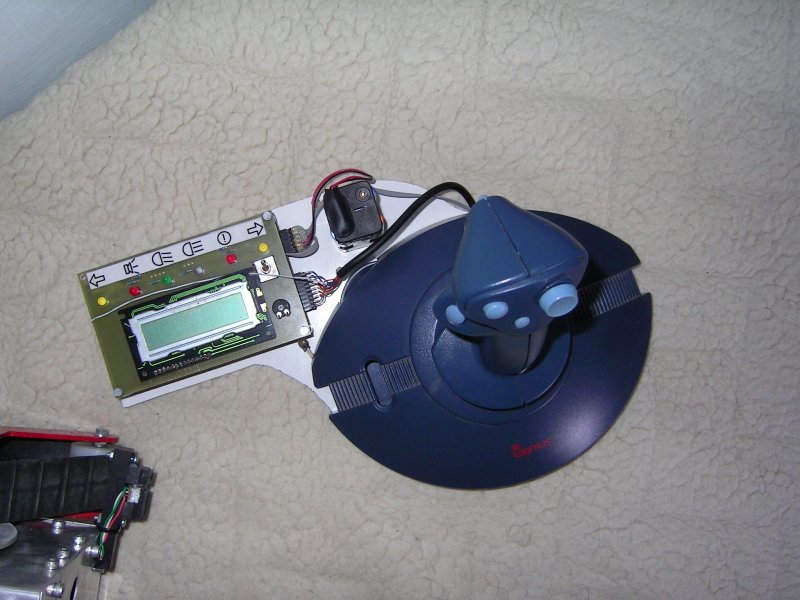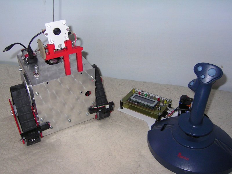 433.9MHz-en kommunikál.Jojstickal irányítható melynek X-Y tengelyein potik vannak ezt a PIC AD-jével digitalizálom. Sorosan küldöm az adatokat 4byten Egy szinkron byte egy sebesség egy irány és a nyomógombok. A robot léptetőmocikkal megy melyeket optokon keresztül szoftverből vezérlek. A távmérők analógok ezek miatt nem megy neki semminek. A magyarokamarsonversenyre már tudja a késleltetést is.