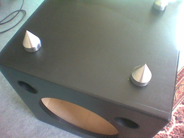 Egy kicsit kíegészítettem a subomat Én nem nagyon hittem ebben de azt kell hogy mondjam hogy vagy nagyon elfogult vagyok vagy pedig tényleg sikerült az akusztikus elcsatolás.Nekem úgy tünik hogy részletesebb lett a hangzás és valahogy tisztább is. Ha másért nem a dizájnért érdemes volt megcsinálni... Ha van valakinek tapasztalata hogy érdemes a kúpok hegyét megtámasztani akkor ne habozzon. Esetleg egy sima fém körrel aminek a közepén van egy kis méllyedés a pozicionállás végett?? Most még ezt kéne megcsinálnom... Valahogy így: Hangszórótüskék Ja a pontos neve alátéttálca Isa. Képek csatolva: