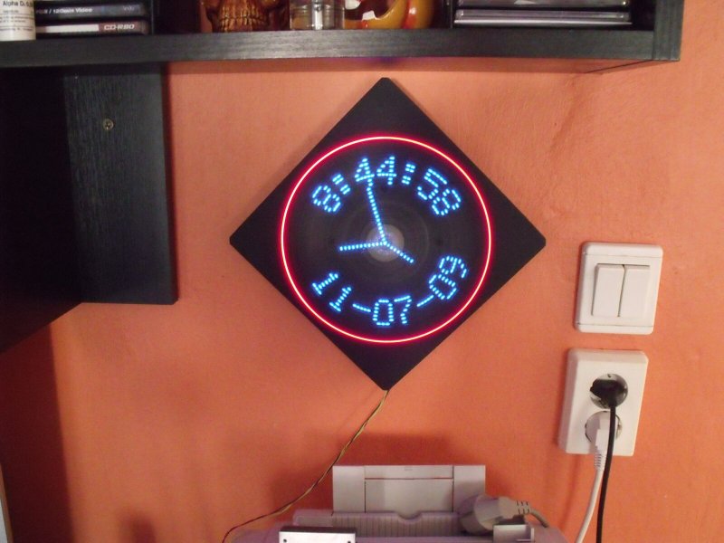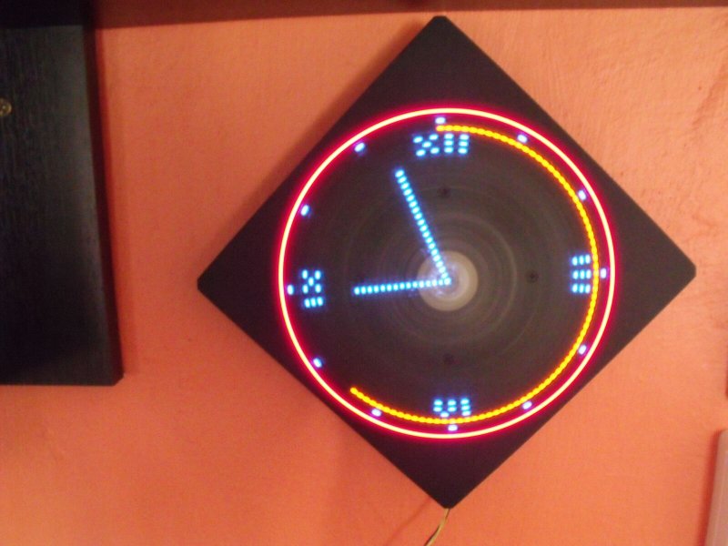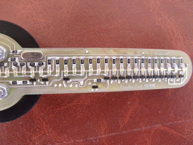Sziasztok! Elkészült az új propeller órám minek a nyákját én terveztem és készítettem Hp41C leírása alapján egy PIC16F886 kontroller vezérli a 26 darab leddiódát de a nyák alkalmas a 18F szériás kontroller fogadására mivel még több szolgáltatás lesz elérhető a jövőben..A programot is Hp41C írta bele miben elég sok extra szolgáltatás van.. Többek között öröknaptár,holdciklus kijelzése,analóg mutatók együtt is használhatók a digitális kijelzéssel mivel 12 darab analóg ledet tartalmaz az óra mi külön vezérelhető egy 2x3 és három 3x3 led csoportokra bontva! Az időt és a beállításokat egy RTC epromja tárolja,dátum,hőmérséklet,holdfázis kijelezhető felváltva és futtatott szövegként is. Méri a fényviszonyokat is és szabályozható,beállítható a fényerő nappali éjszakai üzem fényre vagy időre vált üzemmódot. Továbbá képek,szövegek megjelenítése is lehetséges és valószínű képes lesz fogadni a bázisról PWM-be "ágyazott" jelek vételére mivel az idő szinkronizálható lesz és a DCF időszinkronnak köszönhetően atomóra pontosságú! Ez a fázis még fejlesztés alatt áll.