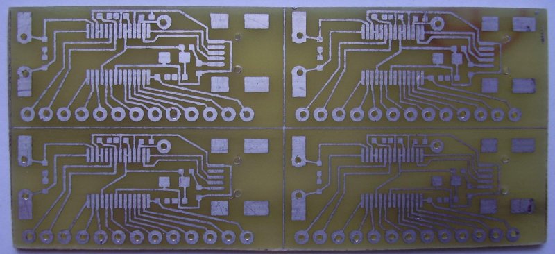 A mai termés egy avr teszt panel, FT232RL usb soros átalakitó panelja és egy kicsit modositott nokia lcd csati adapter panel. Kicsit itt ott nem kellö helyen is megmarta a maratószer mert most kiprobáltam a maradék papir szemcsék eltávolitására a sosavat. Igy a szokásosnál hézagosabb lett a festék fedése.