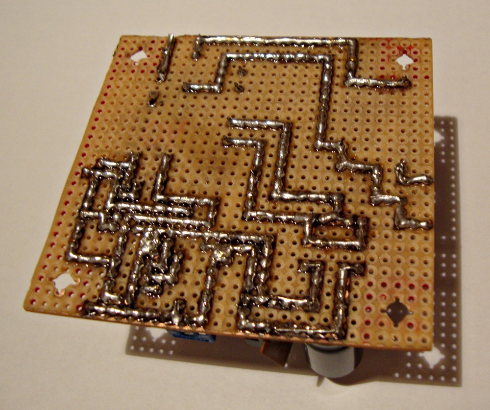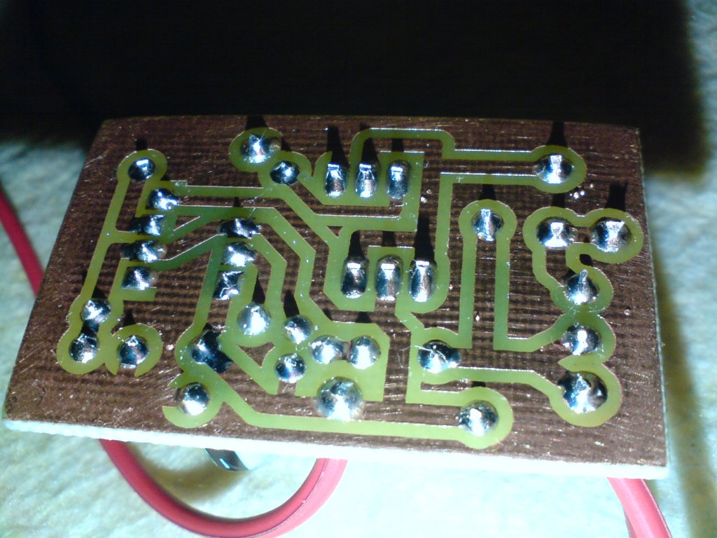 Tanulási teendőim végeztével, volt időm forrasztgatni. Összeraktam a nyáklevilágítóm időzítő kapcsolását. Nincs benne semmi extra: 555-s időzítő, relével kapcsolja a kimenetet. Próba nyákra raktam össze, volt itthon gondoltam elhasználom. De többet sem forrasztok ilyen nyákra . Elrettentés ként felrakok a forrasztás oldalról egy képet . Nagyon ne oltsatok miatta .Üdv.