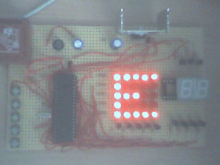 Építettem testáramkört PIC16F877-hez, amin egy 5x5-ös LED mátrix kijelzővan, 2db LED kijelző, és 5db nyomógomb.