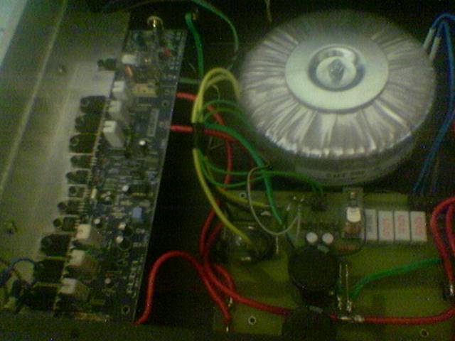 Én ezt az erősítőt dobtam össze! A doboz egyéni készítésű (1.5mm-es lemezből). A végfok meg 2x250W-os. Tápnak egyenlőre egy 500W-os toroid-ot kapott!