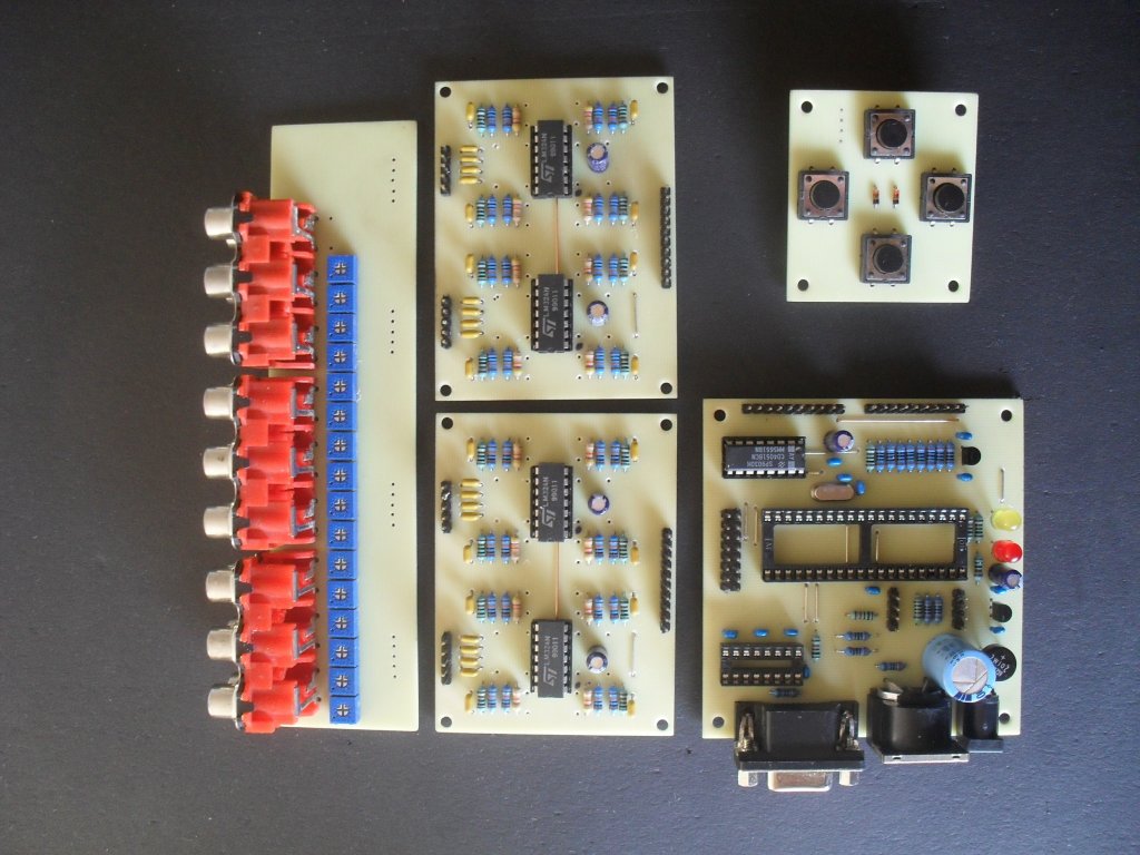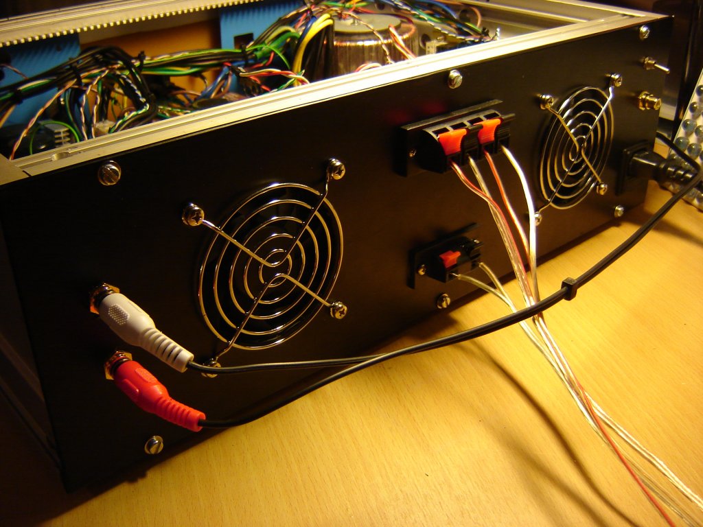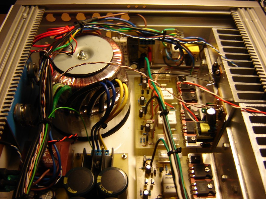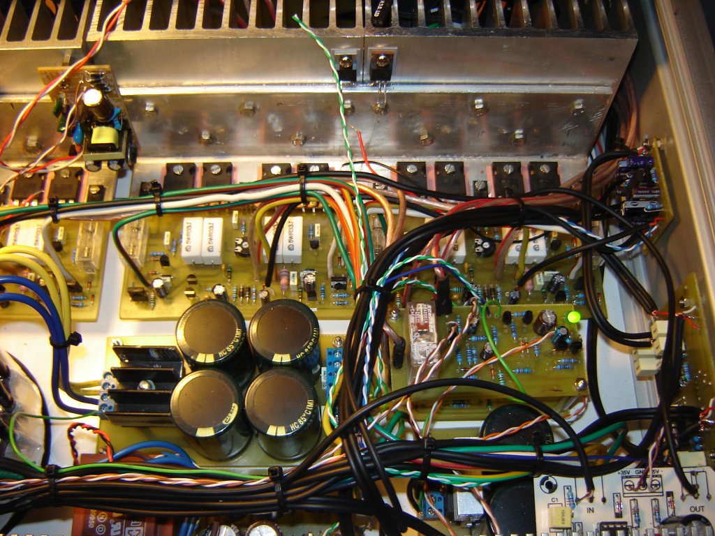Kell annyi trafó: a középső 450W/2x33,34,35V két q-t hajt (saját tekerés). Két 160W-os vidi áttekerve 36V-ra 2Q-t hajt (saját tekerés). 1db Beag 100W/2x28V a Vidi véget hajtja. A kicsi trafó az összes segédtáp.