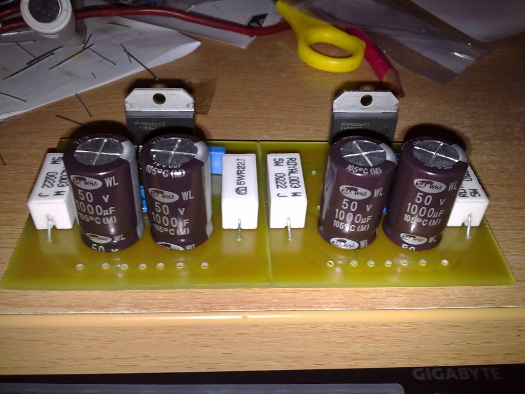 Köszönöm a dícsérteket. A nyák teljesen saját tervezés, az ellenállás pedig a táp CRC szűrése lenne, ami azért került bele, mert az adatlap szerint az erősítő IC A-AB osztályban működik, és ha jól tudom A osztályban szokták alkalmazni a CRC szűrést a búgófeszültség elnyomására. Biztositék a táppanelen lesz. Amúgyis az ellenállások nélkül már nagyon kicsi lenne a nyák