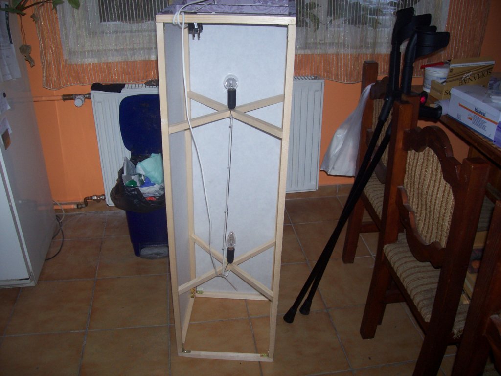 Hát ha a keretre vagy kíváncsi, az alsó és felső rész, négyzet alakú, a végük 45 fokba le van vágva, majd összeragasztottam. A 4 függőleges rúd pedig be van fatiplizve alul, fölül ebbe a keretbe, plusz még fém sarokmerevítő is van csavarozva, minden derékszögnél. A tapétát meg szintén felragasztottam. Remélem segítettem.