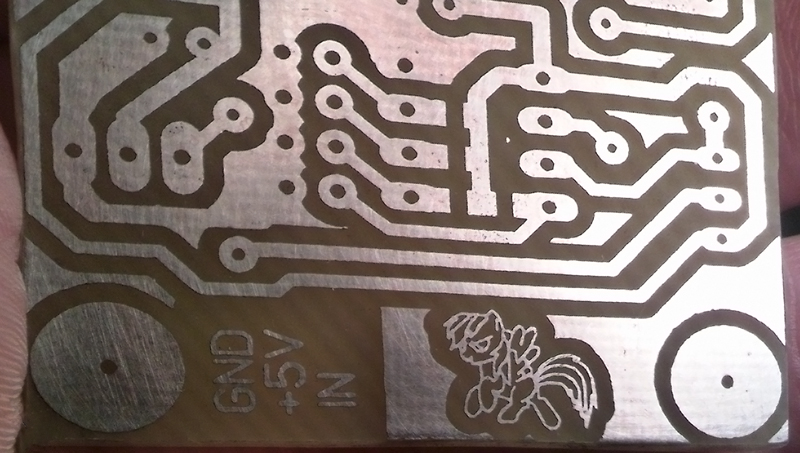 IR adó. Egy pic12F509 a lelke. Nyáktervet elhibáztam. Valamiért egy pnp tranzisztort tettem npn helyett a kapcsolási rajzba (azt jól) ami alapján készült a nyákterv. PNP is jó lett volna bele, de akkor nem tudott volna TTL bemenettel üzemelni csak RS232 szinteken. Majd ha szükség lesz rá, akkor lehet állítgatni a modulációs frekvenciát (most fix 38kHz). Nyák vasalásos módszerrel készült, 0 hiba, még a 0,2mm-es vonalak is megmaradtak tökéletesen.