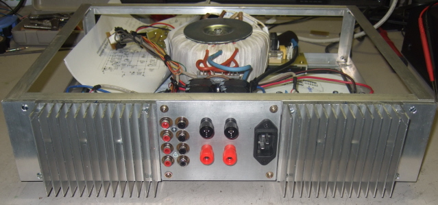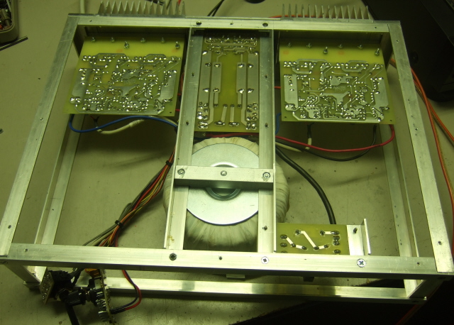 Készülőben van az új Quad erősítőm. A régi helyett most a Ludwig-féle, Alkotós panelon. Trafót, huzalellenállást réges-régről örököltem. Amit lehetett, házilag építettem. Alkatrészeknél felhasználtam, ami volt itthon. Végtranzisztorok újak, MJL-ek. Jó elrendezésű, könnyen szerelhető Alkotó végfok panelja, amit segítségével gyártattam(köszönet érte). A többi panel vasalással, itthon készült. Az erősítést visszaállítottam az eredetire, mert előerősítőt nem szándékozom elé tenni. Bemenetválasztó relés (telefonközpontból bontott relék)+Jaxley kapcsoló. A táp és hangszóró védelem panel közös. A 2-2 elkó nem egyforma, mert kettőt korábban vettem. Az előlap leszabva, de még az elrendezésén gondolkodom. Igaz, sok kezelőszerv nem lesz rajta. Főkapcsoló, bemenetválasztó kapcsoló, hangerő poti. Doboz váza alu profilokból, alja bontott szerver tetejéből készült. A teteje még hiányzik, az is a szerver tetőből lesz. Védelem, Skori-féle, amiben a zenert kellett 82V-ról (ez volt itthon) 66V-ra (szintén itthonról) cserélnem, mert nagy kivezérlésnél néha leoldott. Jaxley kicsit megviccelt, 2 vezetéket fel kellett cseréljek a helyes kapcsolási sorrendhez, amúgy elsőre indult. CD-ről meghallgattam. Szépen, tisztán, zajmentesen szól. Sajnos névleges teljesítményre nem tudtam kihajtani a meglévő hangfalakkal, de később tervezek 150W/4ohm hangfalakon is egy tesztet ismerősnél. Pár kép mellékelve a készítés fázisairól. Köszönet a fórumnak.