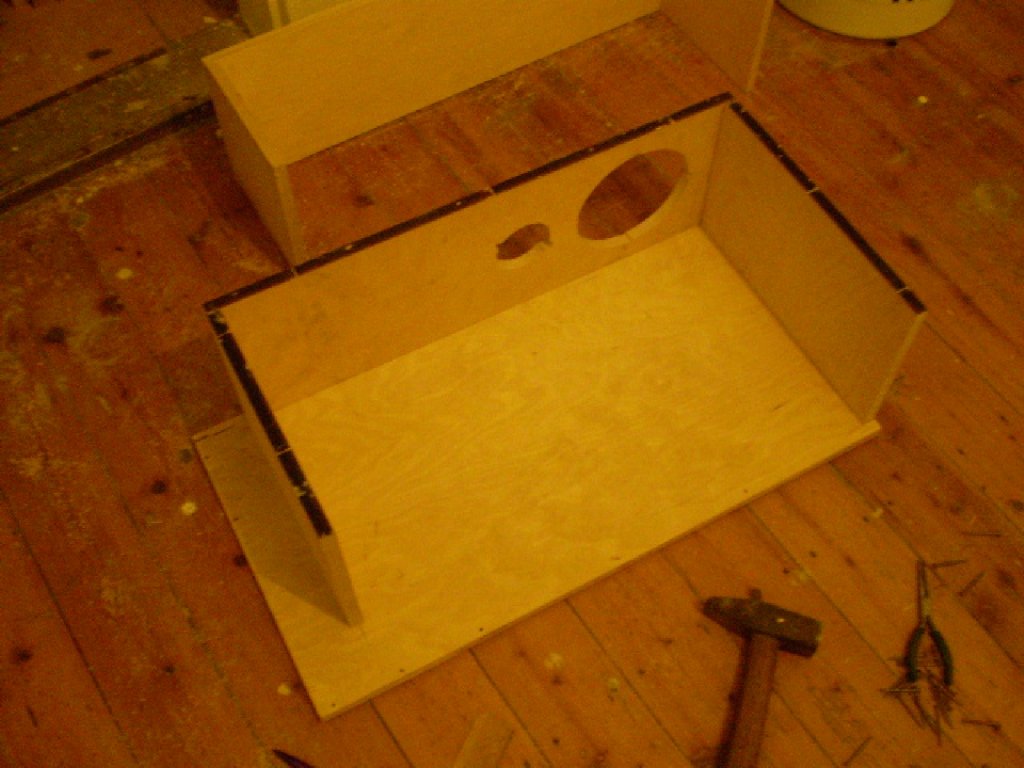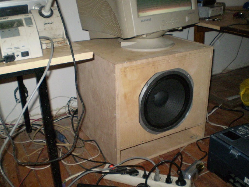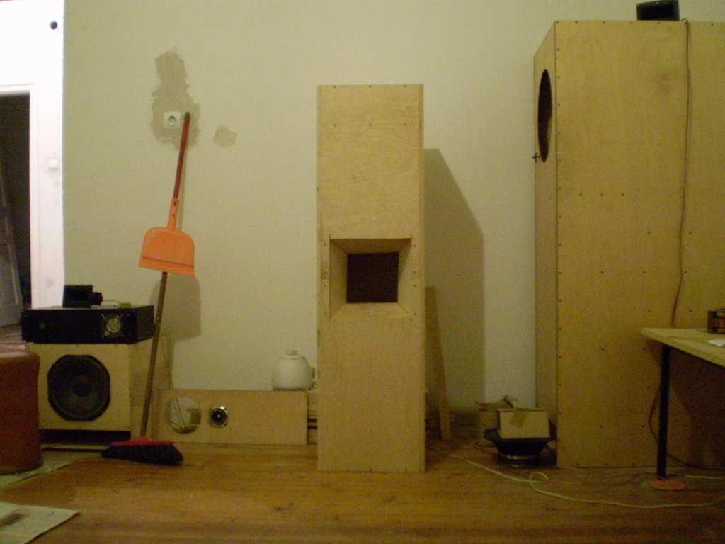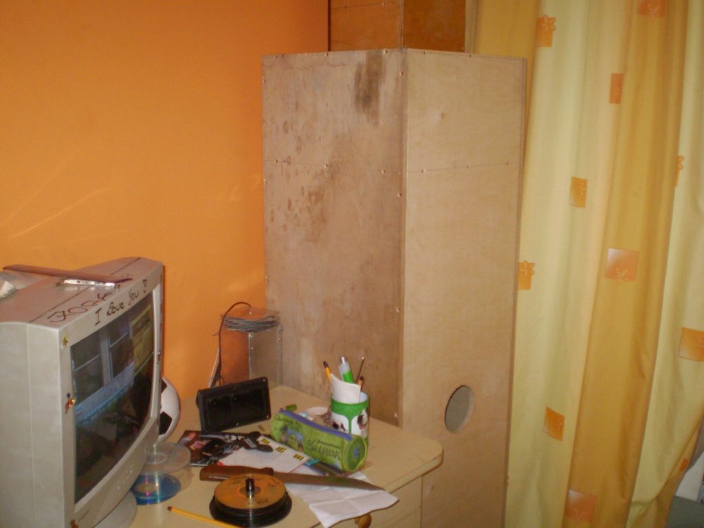 2 darab szerintem jol szolo 16 cm-es hangszoro volt benne. (kb 15-20w ig tisztan szoltak) Nem hittem volna, de egy 4*4-es szoba ablakait hangosan berezgette ez a doboz. Kesobb szetszedtem mivel en nagyobb ladakat epitgetek, ha tehetem ez a par fajta kisebb kivancsisag volt. Ma egy peldany az ocsemet szolgalja ha minden igaz, mert neki csinaltam azt amelyiken kor alaku 11 cm-es nyilas van. Ennel megneztuk es erdekes volt, hogy 1 meterrol ugy lobogtatta az A4-es papirt mint valami vihar egy torulkozot. Azert akkora es olyan a nyilas, mert viszonylag keves idom volt es valamivel melyebb hangokat is akartam. A doboz mereteit egyebkent probaltam csokkenteni de par centi is azonnal megolte a hatasfokot. A hatso resz egy a 40*40 cm-es belmerettel asszem 12 cm-es melysegben adott helyet egy-egy darab hangszoronak. Lathato a kiserleti joval kisebb peldany is az egyik kepen. Kulmerete nagyjabol 154*45*45 vagy valahogy igy alakult.