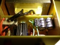A fordulatszabályzója nem működött, a csapágyából már hiányoztak a golyók, a tokmánymenetet is megszadizták kicsit, és nem volt befogópatronja, de egyébként nagyjából mindene megvolt ömlesztve egy zacskóban. A mechanikai részhez kellett egy csapágy, és egy befogópatronsor, és a menetet kicsit kiigazítottam. A fordulatszabályzója tirisztoros volt, és azokról sok jót nem olvastam a neten, így beraktam egy billenőkapcsolót a szabályzó helyére. Tápegység meg amúgy is kellett hozzá, mert felújítás után labortápról próbálva alacsonyabb fordulaton nem volt nyomatéka, így építettem egy PWM szabályzós FET-es szabályzót, és egy trafó mellé bedobozoltam. A kapcsolást az elektrotanyán találtam: LINK