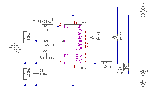 Itt a kért két kapcsolás. - A Lampe-02 a tompított bekapcsolása. Ha ráteszed a gyújtást, nem történik semmi feszültséget kap az áramkör. Ha elindítod a motort, akkor az olajgomba testre zárja az OIL bementet. Ezt az infót az RS tároló megtárolja, és ha letelik a kb. 10 sec akkor bekapcsolja a lámpát. Relének valami fényszórót kapcsolni tudó relé kell. (Relé számozást ne nézd.) - A Lampe-04 a Led-es menetfény bekapcsolása. Ez egy számlálóból áll. Ha a gyújtást ráadod, akkor az törli a számlálót, Q14 kimenet alacsony szintre vált. Az R5 ellenállás bekapcsolná a Fet tranyót, de a D2 ezt nem engedi, mert "elszívja" R5 áramát. Ha leveszed a gyújtást, megszűnik a D2 tiltása, de a számláló törlése is. A lámpák bekapcsolódnak. A számláló elszámol a Q14 kimenetéig. ekkor Q4 kimenet magas szintű lesz, ami kikapcsolja a lámpát, és D1-en keresztül leállítja a számlálást. A számláló, addig itt áll, míg a következő törlőjelet (gyújtás be) meg nem kapja. ekkor kezdődik elölről az egész folyamat. Az áramkör állandó 12V tápfeszt igényel, de köszönhetően a CMOS technikának, kb 100uA fogyasztása lesz. (Első tápfesz bekapcsoláskor nincs törlés, ekkor a számláló bárhol állhat, vagy is lehet egy darabig világítani fog a lámpa.) üdv! proli007