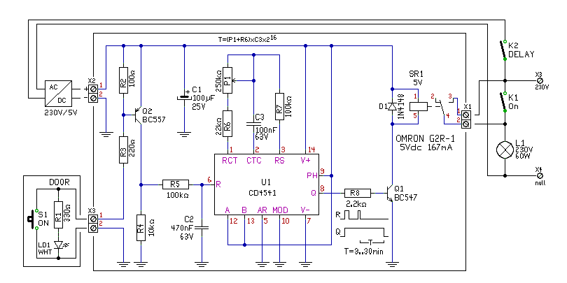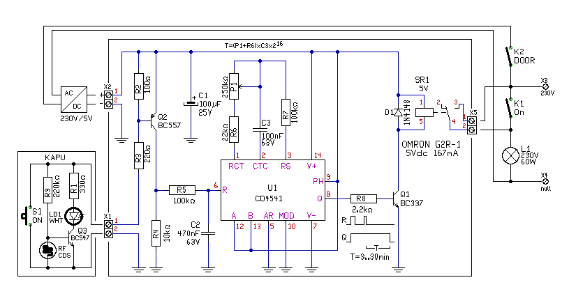 Hello! Természetesen működne 5V-ról is, de akkor a tápnál lévő stabilizálást-diódát el kell hagyni. Valamint a relének 5V-osnak kell lenni. A kapunál lehet egy egyszerű kis áramkört alkalmazni, hogy a gomb világítson is, és két vezeték elég legyen hozzá. Egy fehér Led 2mA-el már bőven jól világít. Ekkor ha az időzítő fel van kapcsolva, az is látszik, mikor elmész. Az R1 az eredeti kapcsolás R1-es ellenállása.. üdv!