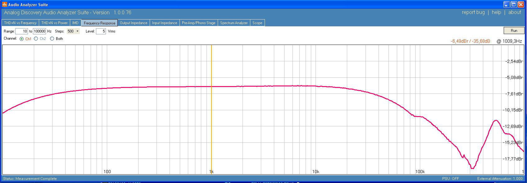 Szerintem 1kHz tetőesése alacsonyabb frekin átviteli problémára utal, vagy méréskor nem DC állásban mértél. Ez a 100Hz-en is látszik.