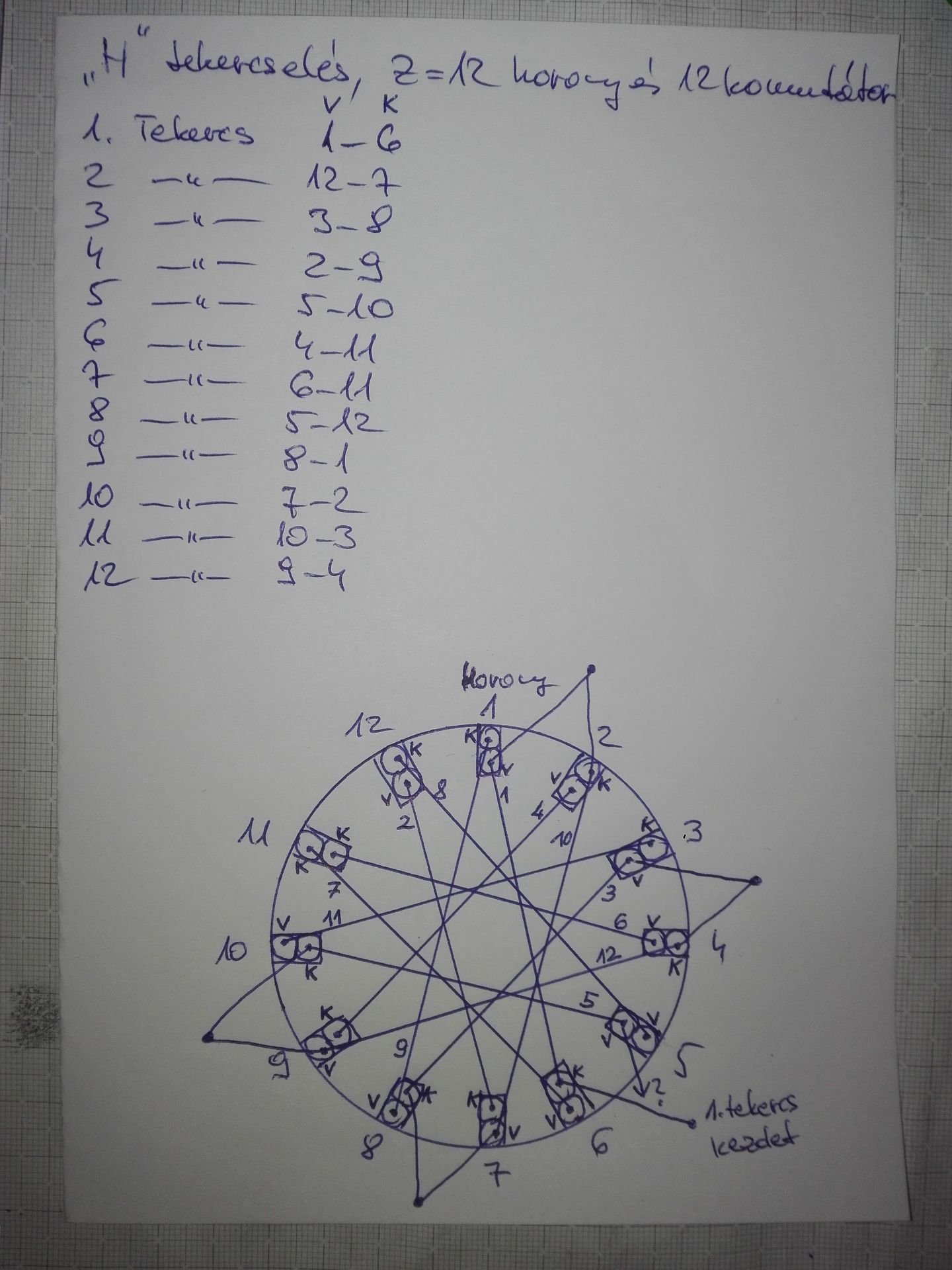 Átnéztem én is a Barabás-Karsai könyvet, a 248. oldalon ír erről, a "H" tekercselés lenne jó szerintem. A 249. oldalon táblázatban a 12 hornyos forgórészhez megadja a tekercsek elhelyezését. Lerajzoltam úgy, ahogyan a 10 hornyosnál elmagyarázta a bekötésüket, de itt nem jön ki nekem: az 5. tekercs vége a 6. horonyban nem talál szabad tekercskezdést, csak véget(rajz)