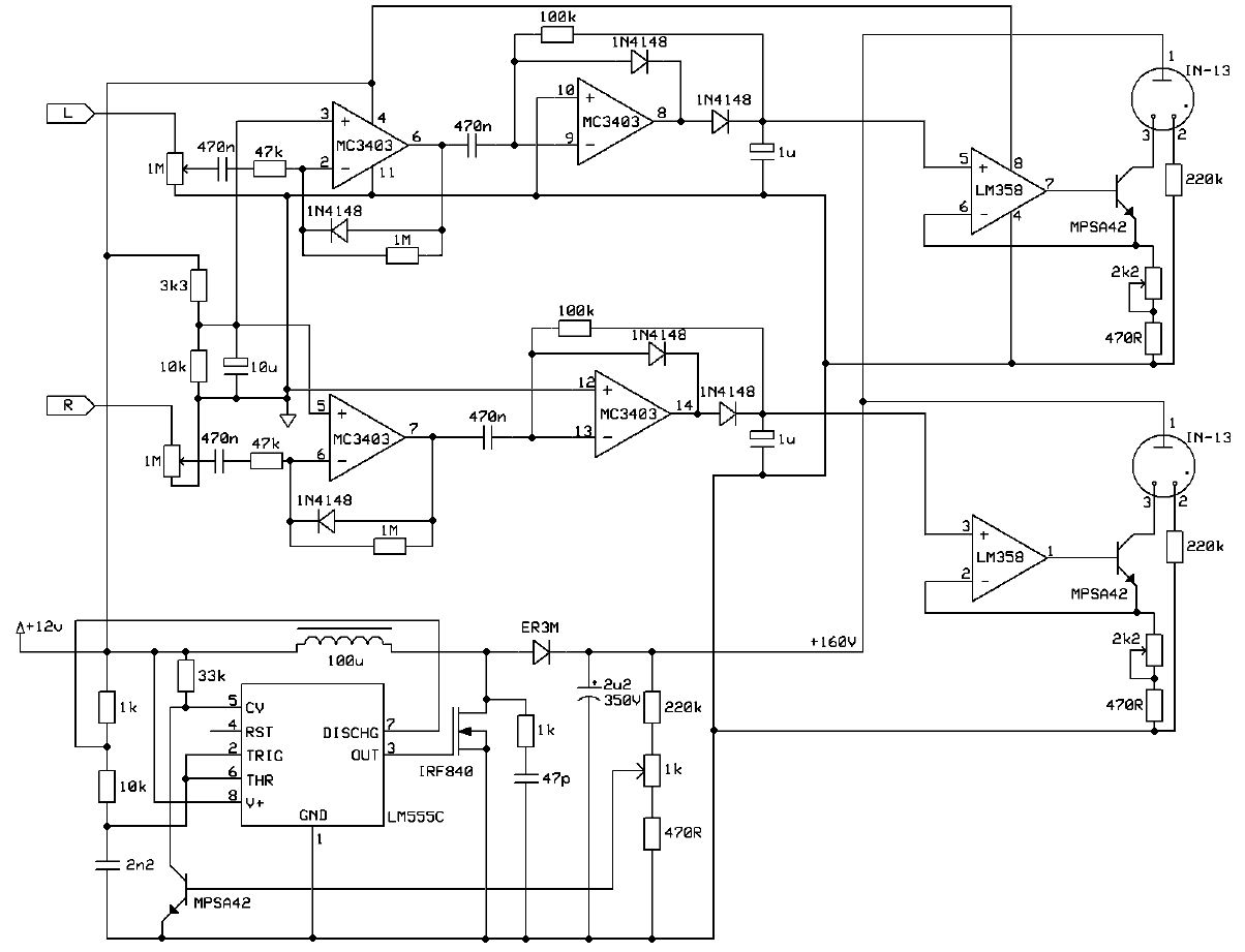 Itt van 2 egyszerűbb, de a helyi kapcsolások közt is van, meg 5532-vel is megoldható a dolog. 400Ft-ért már lehet kapni IN13-at. Sztereót nem úgy tudsz véletlen csinálni, hogy két monót építesz? ( -> monót meg úgy, hogy a sztereót szétszeded két külön részre)