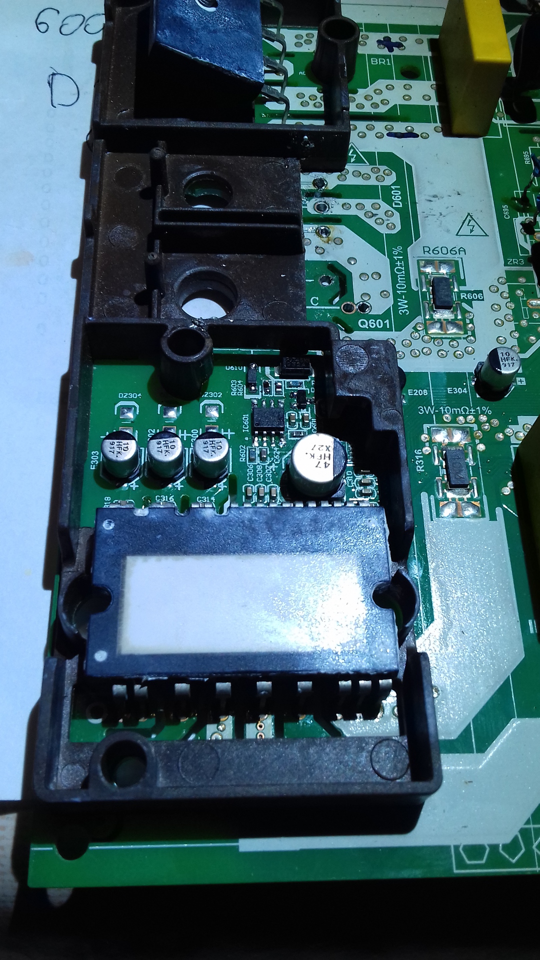 Szia! Köszönöm a válaszod! Közben kiderült hogy zárlatos az Igbt melletti duál dióda is.Igen az Igbt gate felé is át ütött, de vissza felé nem látok ill. nem mérek zárlatot ( attól még lehet ott is baj). Az inverter Igbt-je ez, a fotón Ic601 az Igbt meghajtó 8lábú smd. Az alatt az inverter Ic látható. Érdekes egyébként hogy szinte senki nem javít ilyen dolgokat. Tudom hogy a klímás nem műszerész,de(én sem vagyok az) Ha tudnád hány mikró ,tv,mosógép,erősítő,monitor,co-hegesztő stb javult meg a kezem alatt.