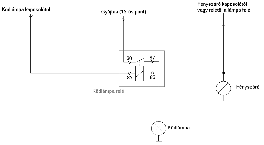 Hivatalosan csak annyi megkötés van, hogy a ködlámpa nem világíthat együtt a fényszóróval. Emiatt a reléjének a testvezetékét a fényszóróra kötik, hogy ha bekapcsolod a refit, kialudjon a ködlámpa. Ezt mostanában egyre kevésbé veszik figyelembe... de gyorsan lerajzoltam, mit hova kellene kötni. A relén a 30 a táp be, 87 a kimenet a lámpák felé, 85 a relé pozitív, 86 a relé negatív. Ha a 30-as pontot nem gyújtásra, hanem akksi pozitívra teszed, nem kapcsol ki a ködlámpa a gyújtás elvételekor (csak ha a kapcsoló is gyújtáson keresztül kap áramot, most ezt a te autódra hirtelen nem tudom megnézni). A relénél arra ügyelj, hogy a ráírt max. áramot ne lépd túl, különben összeég. Ha (csak példa) 2 db 60 W-os lámpát akarsz meghajtani, az üzem közben 120 W / ~14 V, azaz ~8,5 A áramot jelent; ezt, a hideg áramot is bekalkulálva, legalább egy 20 A-es relével szokás kapcsolni.
