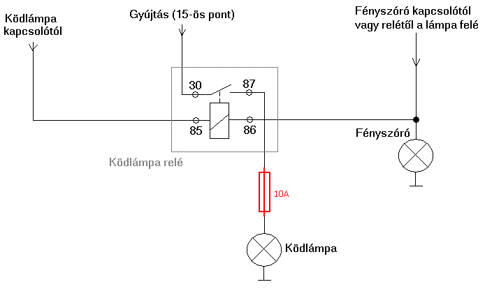 A relé tekercsének egyik végét kösd refire (56A), másikat a ködlámpakapcsolón keresztül helyzetjelzőre (58).