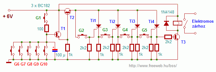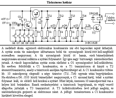 Javítom itt a poontos leírása: A kombinációs zár nyitásához 10 másodperc időtartamon belül kell öt gombot megfelelő sorrendben megnyomni. A 10 nyomógomb közül 5 hamis, ezek megnyomása nullázza a nyitási folyamatot. A kapcsolás szerint a G1 az első helyes nyomógomb. A megnyomásakor feltölt a C1 kondenzátor, és a T1 tranzisztoron át kinyit a T2, amely a tirisztor anódjára rákapcsolja a tápfeszültséget. A C1 kondenzátor töltése kb 10 másodpercig elég a négy tirisztor egymás utáni begyújtásához. Ha eközben bármelyik hamis gombot megnyomjuk a C1 azonnal kisül, vagyis előlről kell kezdeni a kombináció beadását.