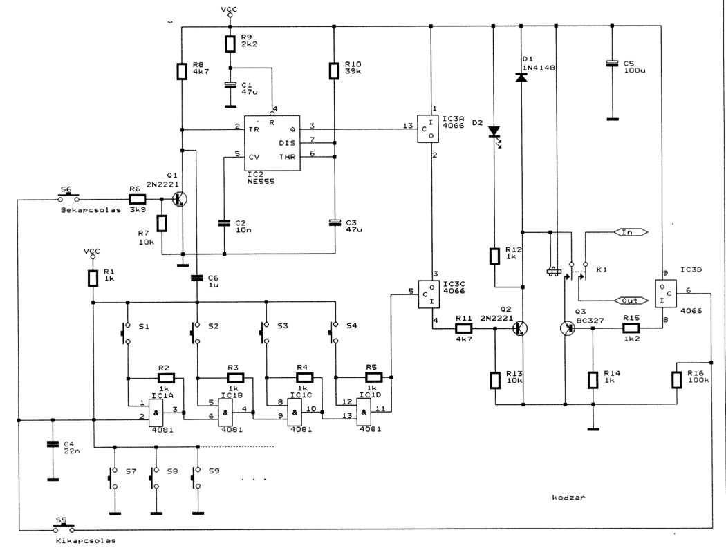találtam egy kódzáras kapcsolást, ami egy CD4016-os IC-re alapul, csak egy a bökkenö, hogy nincsenek beirva az adatok...