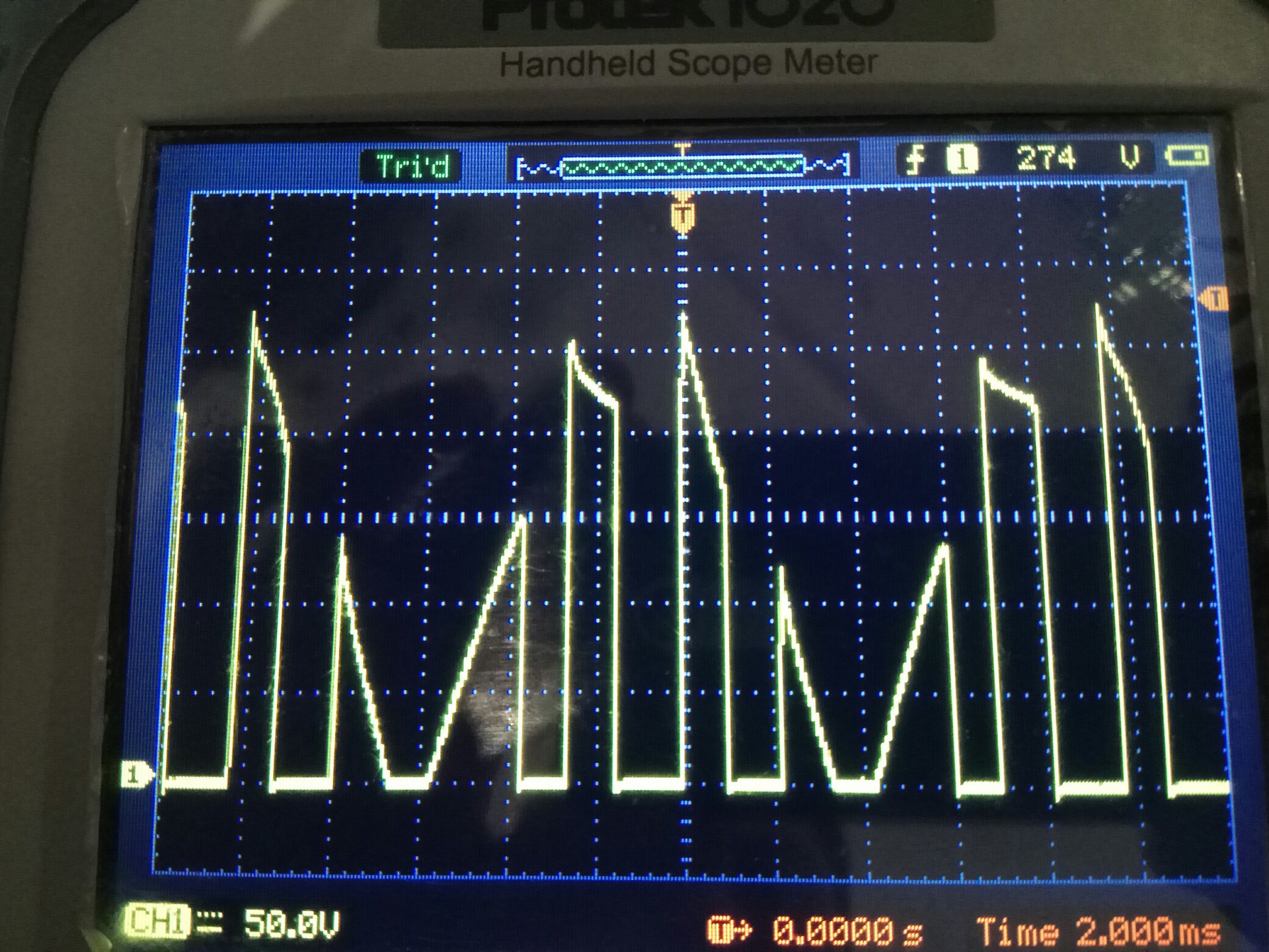 Megnéztem - mostmár - földfüggetlen szkópon a tekercsekre menő jelalakot. A kisebb jelszintű elég kusza, a másik - ez tűnik a szabályzásnak - félperiódusonként négyszer kapcsolja a kétoldalasan egyenirányított, leválasztott 230V-ot. Az egyik kép minimumon, a másik mximum lángnál készült, de itt éppen működött a cirkó. Reggel kiderül, hogy amikor nem indul, milyen lesz a jel...