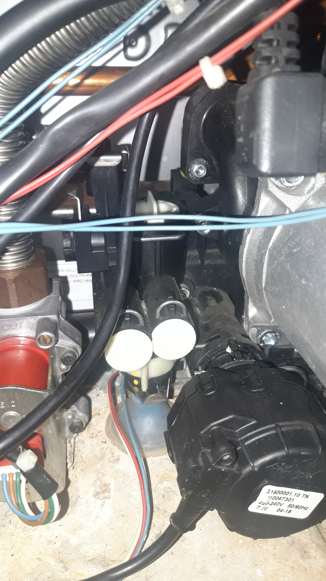 A háromutú szelepmozgató motor mellett, amihez a fehér-piros-kék vezetékek csatlakoznak. A feltöltő csap nyakára van felhelyezve a hall érzékelő bilincse de maga az érzékelő hátulra nyúlik be. Felülről van egy fehér záró kupak, talán azt kell kivenni, hogy a forgórész látható legyen. A hálózati vizet biztosan el kell zárni de jobb lesz ha a szerviz csapokkal is ezt teszed.