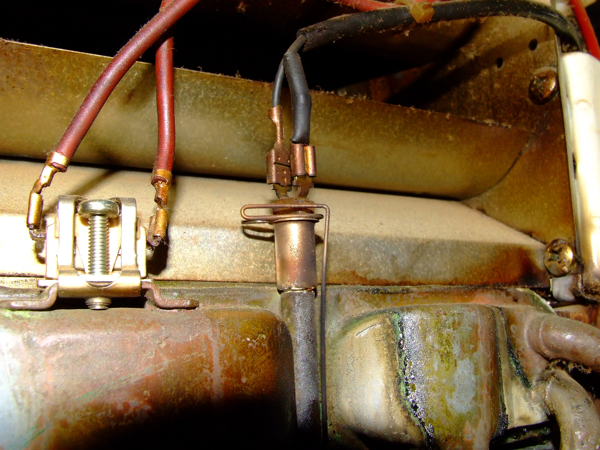 Közben találtam még egy problémát: A fotón látható - jobboldali - termóelem (?) megmozgatása esetén kialszik a gyújtó láng. Lehet, hogy ezért is lehet nehezen begyújtani a kazánt, ha valamiért le van kapcsolva. Úgy látszik ez is végét járja