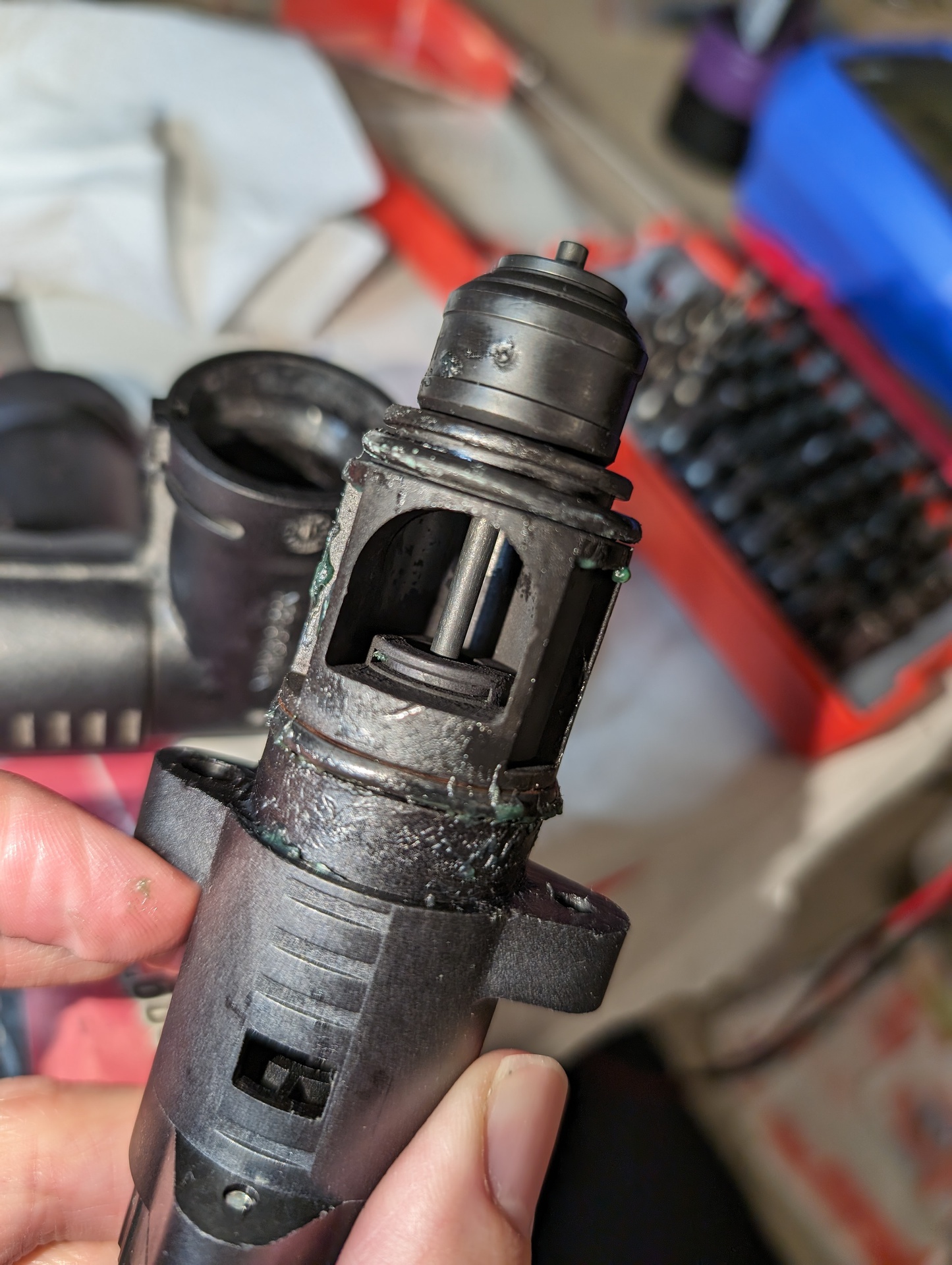 Leszedtem a vezérlőelektronika burkolatát is, tisztán látszik, hogy egy ULQ2003A tranzisztormező hajtja meg közvetlenül a motort, szerintem ez nem csinál olyat, hogy általában működik, de néha nem. Széthúztam a régi váltószelepet, a fém tengely matt fekete. Ez vajon normális?
