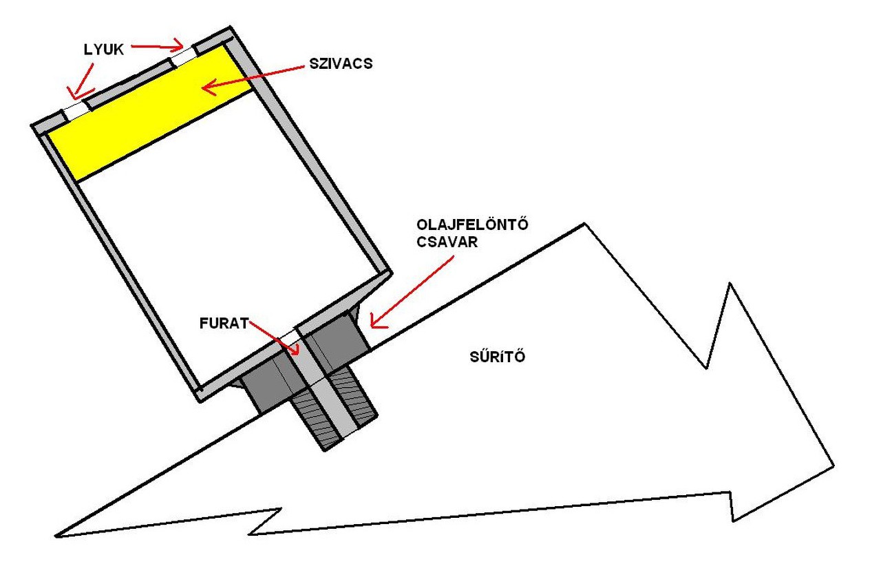 Amikor láttam, hogy lefúl a motor az olajfelöntő nyílás csavarja volt az első amit kitekertem, hogy a kartergáznak legyen hova távoznia, de az eredmény ugyan az volt. Most dolgozok, a kartergáz kivezetésén, eddig átfúrtam egy 3,5mm-es fúróheggyel a felöntőnyílás csavarját, ezt tovább szándékozom bővíteni 6mm-ig, majd a mellékelt skiccen látható módon szeretném kivitelezni a továbbiakat. Az olajfelöntő nyílás csavarja a sűrítő "tetején" lévő M12 csavar.