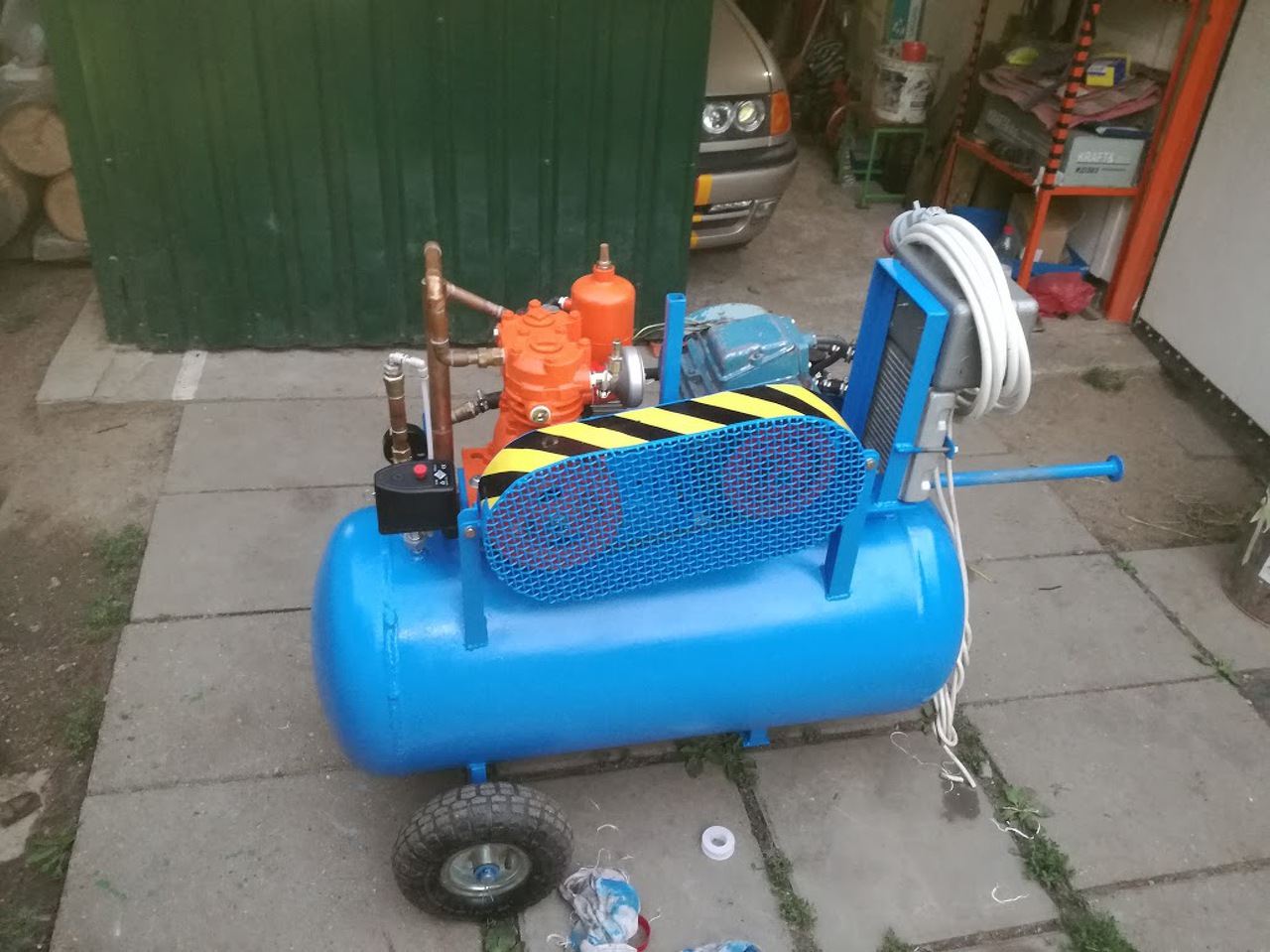 Én is végre látom az alagút végén a fényt, és nem dudál ![]() Régóta csinálgatom a kompresszort kisebb-nagyobb megszakításokkal, de a hétvégén a festésen túlestem, most az újbóli összeszerelés, véglegesítés van soron. A tartály 113L-es, a kompresszor Zil 131, Kamaz kompresszora, teljesen felújítva, 1.5KW-os 3 fázisú motorral tekertetve, a légszállítása 200L/perc körül van.