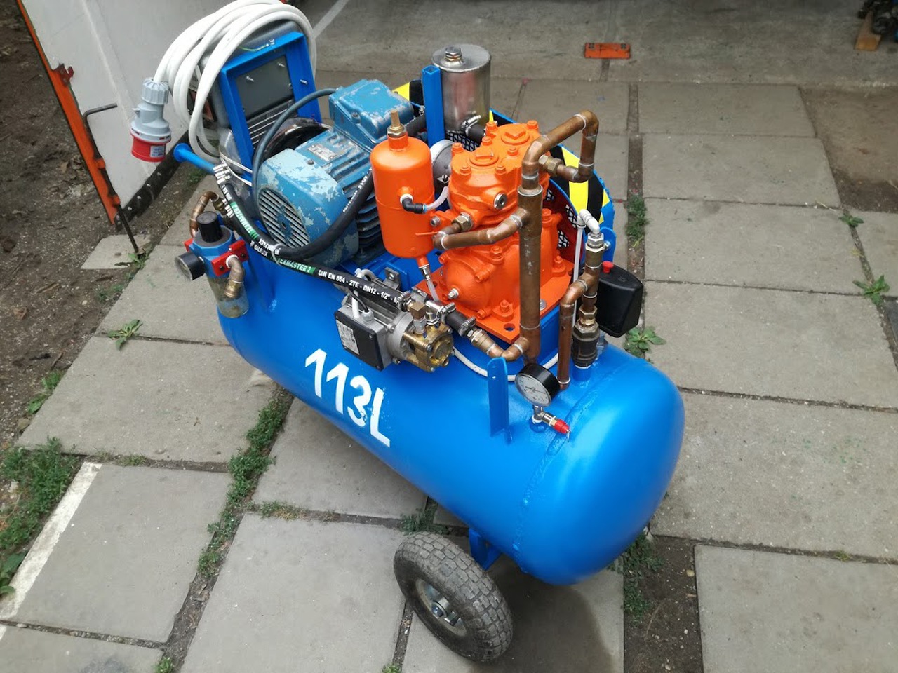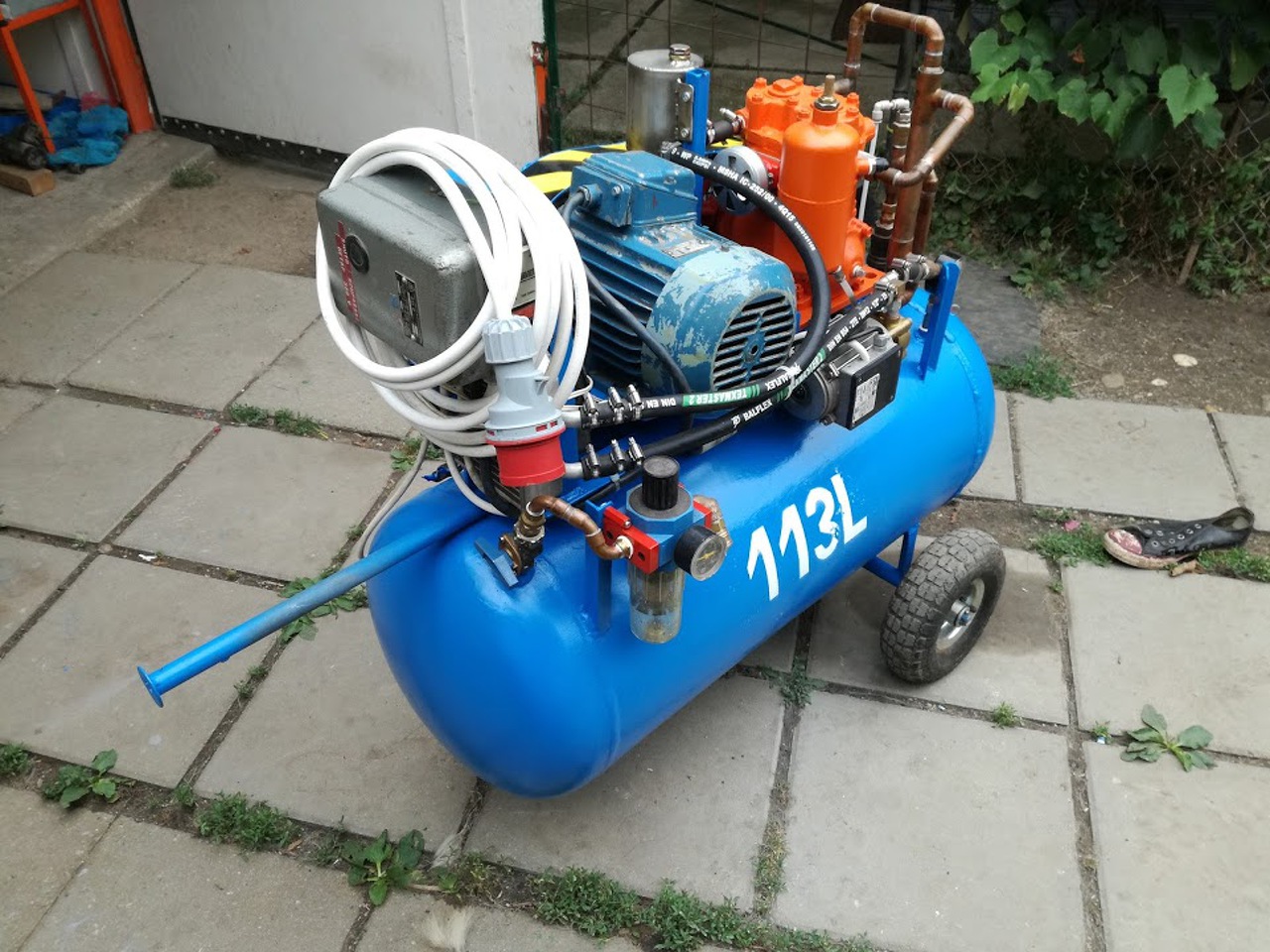 Mondhatni kész a kompresszorom, már csak egy hűtőventilátort kell fölszerelnem (a mostani ideiglenes) a vízhűtőre és készen is vagyok. A légtermelése egészen jónak mondható, 113L-es tartályt 0Bar-ról 8Bar-ra 4perc 40másodperc alatt tölti föl.